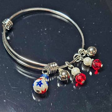 Each bangle is single but gives the illusion of three. Exclusive to us, this bangle also features a 100% American pewter charm and is expandable from 7 inches - 8 inches making it one size fits most.