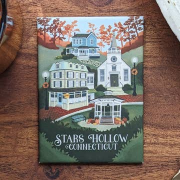 With art inspired by vintage travel posters, this magnet is the perfect souvenir from the fictional little town we revisit every fall, Stars Hollow, Connecticut. Featuring the town square gazebo (adorned with pumpkins of course), Luke's Diner, and Lorelei's house, it's a fun item that Gilmore Girls fans will love to grab as a gift, stocking stuffer, or just to add to their own magnet collection. Magnets are 2.5x3.5" and have a soft-touch matte finish, giving this vintage design a modern touch.