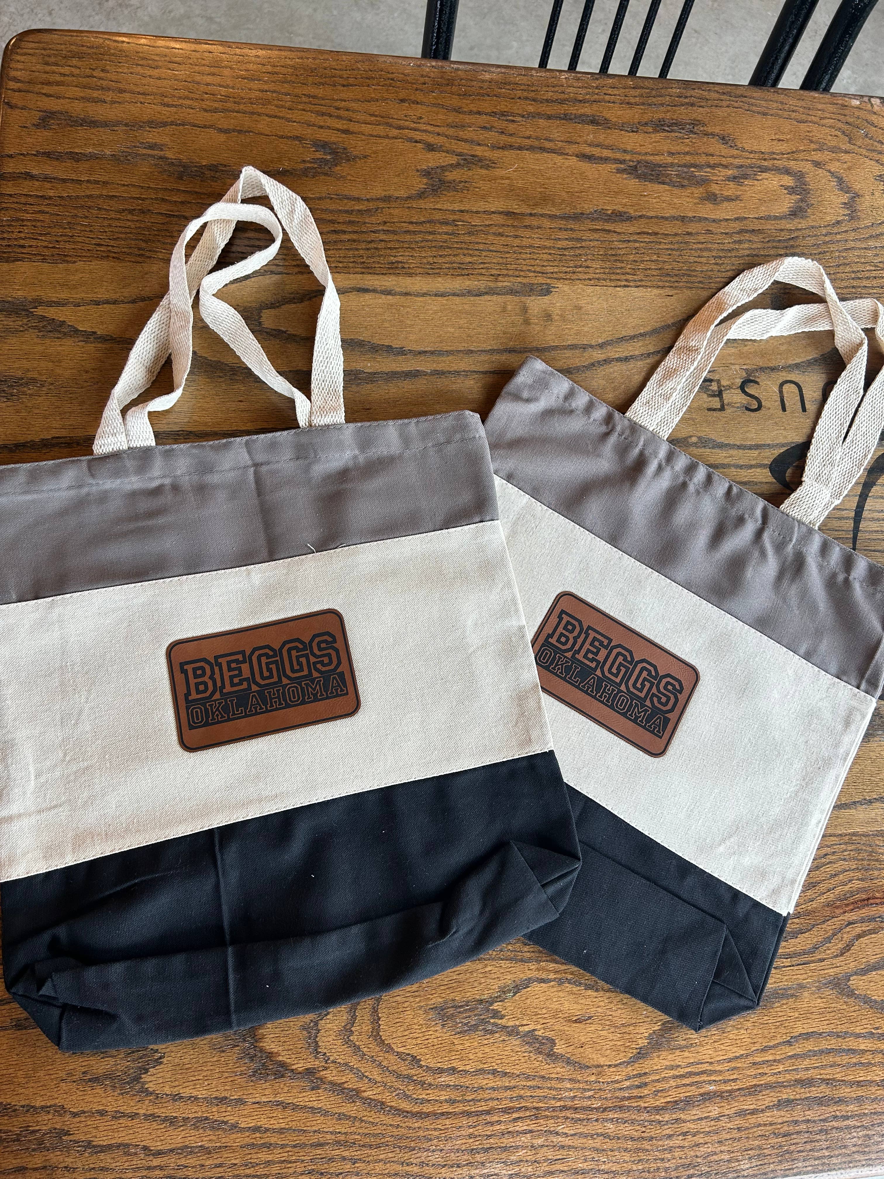 Market Tote with Vegan Leather Patch - Farmers Market Tote, Shopping Bag, Stylish Shopping Tote, Zippered Tote, Beach Bag, Overnight Bag. Grab your customized tote for easy shopping around town. Easily holds your market purchases, farmers market goodies, library haul, whatever you need to carry, all while looking stylish. We offer 3 different bag styles in several different color options. Please email your logo to 3CETCHING@GMAIL.COM. Market Tote - 14 3/4" x 14 3/4" x 5" Tri-color Tote - 15" x 15" x 3" Zippered Tote - 18" x 14" x 4 1/2" Material: Canvas, Cotton.