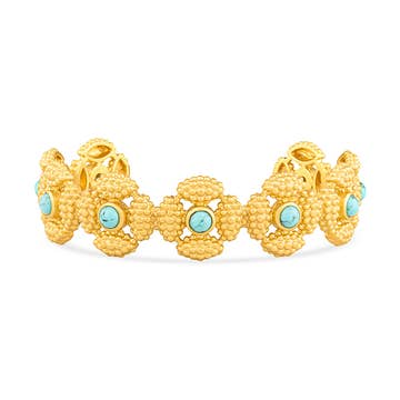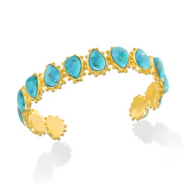 Encircle your wrist in the Turquoise Studded Cuff and channel the serenity that turquoise brings. This gold bangle features 24 round turquoise stones in bezel settings. Designed from brass and plated in brushed 18K gold, this cuff is adjustable for easy wear. Worn in tandem with our Turquoise Pendant Necklace or Turquoise Circle Hoop Earrings, or mixed in with your favorite bangles and cuffs, this turquoise bracelet will ground your look. Details METAL 18k Gold Plated Over Brass MATERIAL Turquoise SIZE Adjustable, 2.2 in, 4.5 mm width Please note: Due to the one-of-a-kind nature of the turquoise, exact colors and patterns may vary slightly from the image shown.