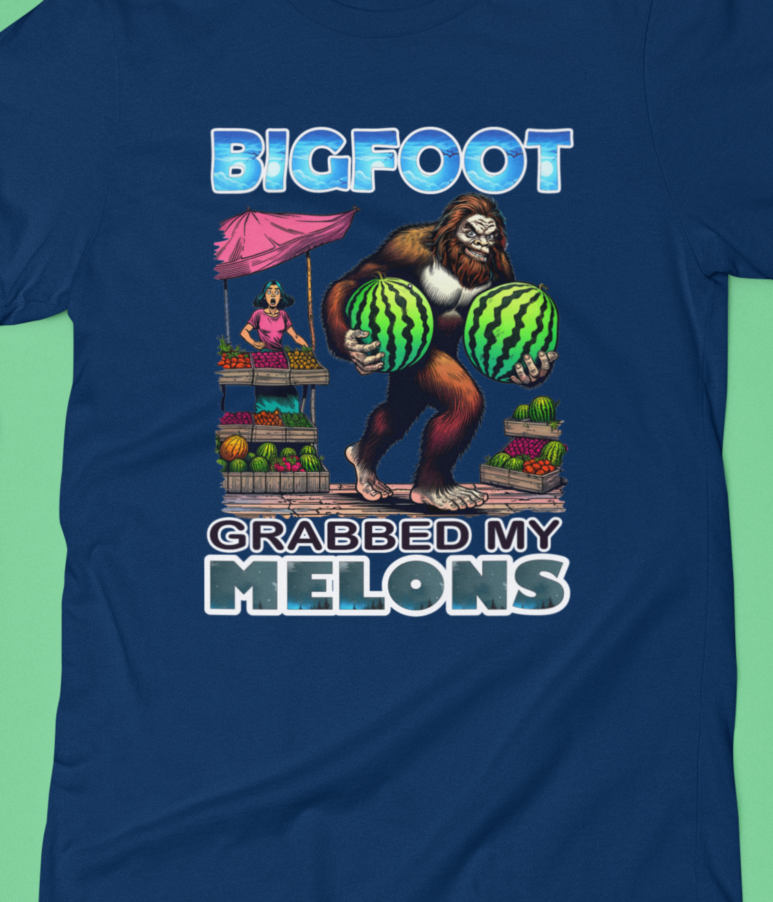 Modern, full color DTF transfer design. Design features a Sasquatch captain on a pirate ship. Dtf print is durable and flexible to hold up better in the wash. Shirt is Gildan Heather Navy. (Mockups may vary in color.)