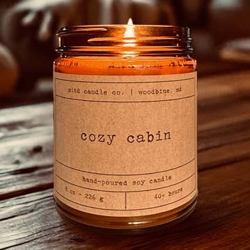 Cozy Cabin Soy Candle-This is one of my favorite scents we make! I don’t have a cozy cabin nor do I know someone who has one, but if I did, it would smell like this. Scent Notes-smoky woods, clove, caramel, cashmere musk Size Options- 8oz clear glass jar & 4oz black tin Aside from the all-natural ingredients, all of our candles feature a unique description that is meant to transport you to a relaxing place! Materials-We use a natural soy wax, cotton wick (lead and zinc free) which is self trimming and clean burning, and phthalate free fragrance oils. Glass canning jar is reusable! All of our candles are hand poured with love by me in my home in Bucks Country, PA!