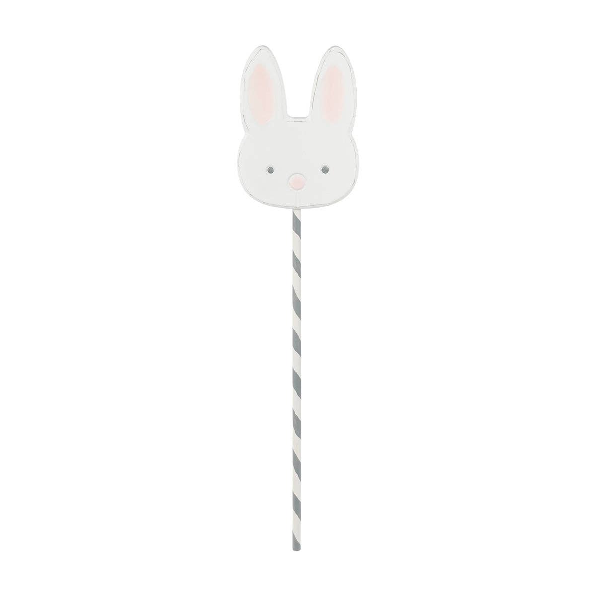 Penelope bunny pick, min. 6. Measurements: 3" w x 12 3/4" t x 1/2" d. White bunny head cutout on white and gray striped wooden dowel.