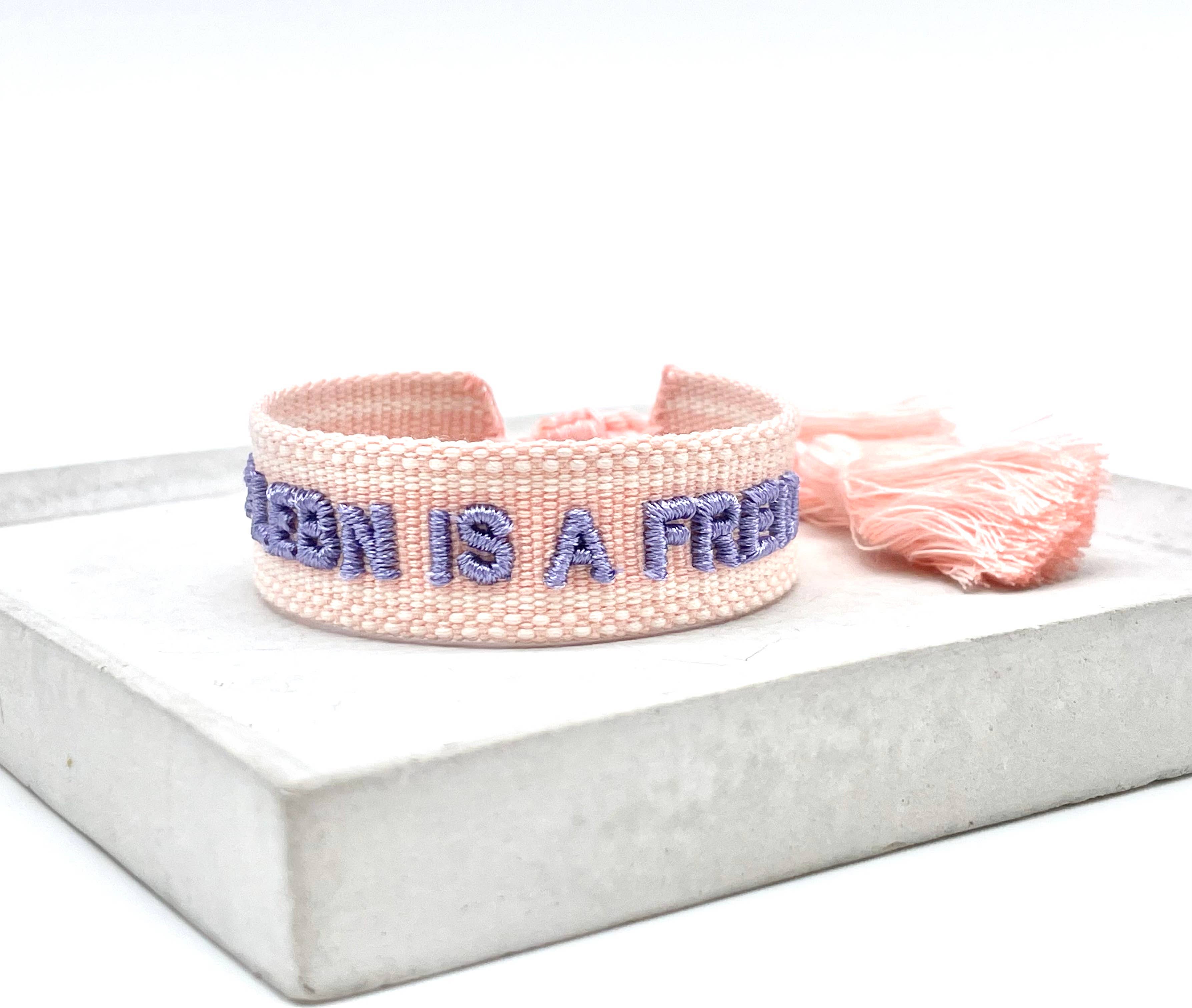Statement Bracelet in Boho Style Comfortable and soft on the wrist, this casual statement bracelet will surely become your daily companion quickly. The ideal gift for your crew, your besties, and your loved ones. MORE AMORE Bracelet: Lilac Text: Neon coral DELIVERY 1 piece Bulk packaging ONE SIZE Adjustable - the size is adjusted via the cords (sliding knot). Approx. 15.5-23.5 cm Height: approx. 18 mm MATERIAL 100% polyester, washable Tightly woven and embroidered