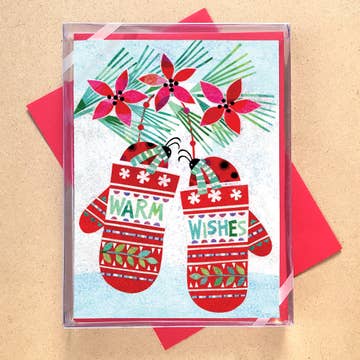 Knitted mittens with various patterns circle the text. front greeting warm wishes inside greeting blank format 4.25 x 5.5 inches, folded (A2) printing letterpress printed in our Acton, MA studio paper FSC-certified cover made from 100% post-consumer waste envelope kraft origin USA item no. TTH2485 / TTH2485BOX