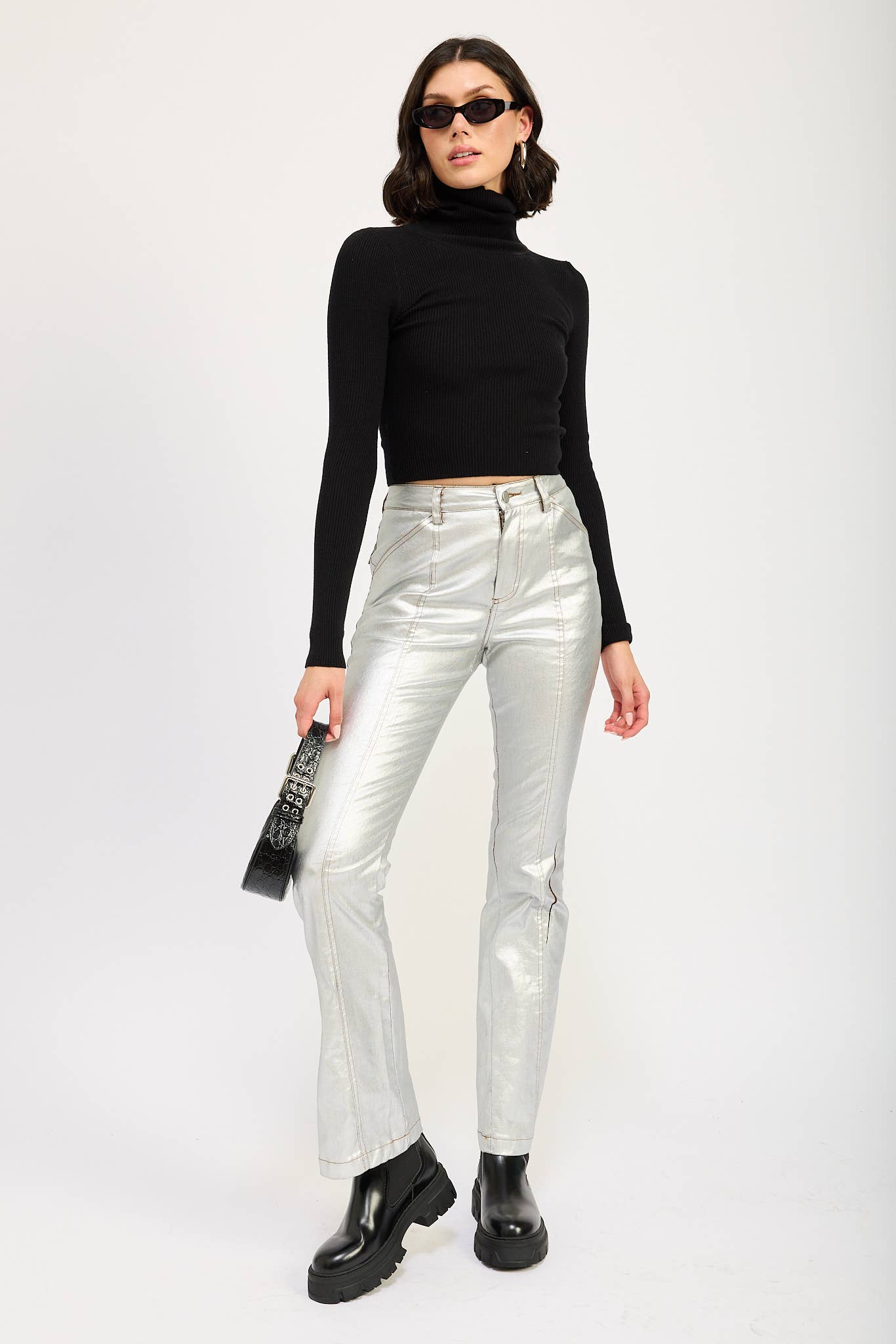 High waisted PU trousers with straight leg fit. In an amazing iridescent metallic these look great teamed with a fitted top and heels for a night out!