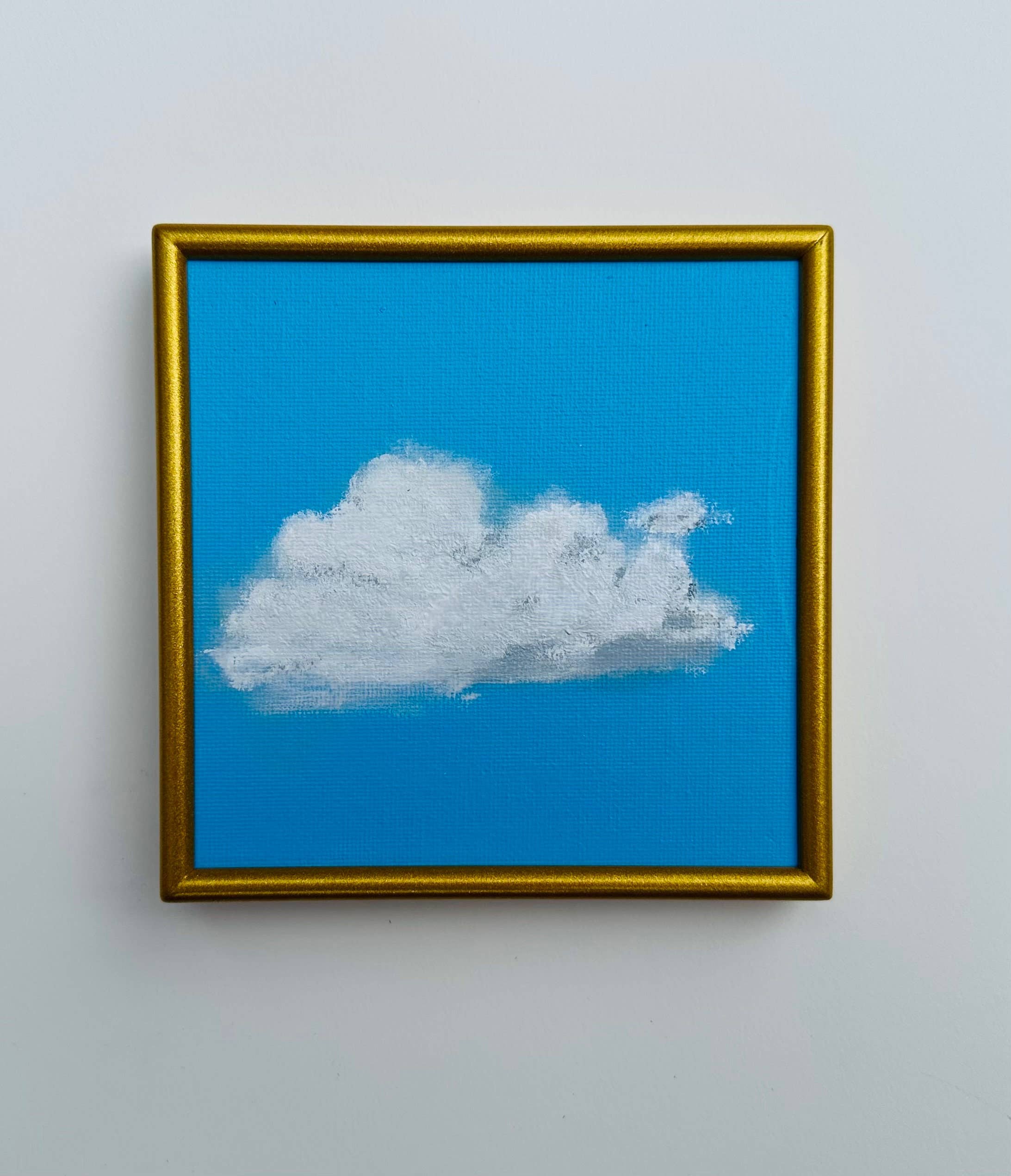 Storm Cloud: A dark and ominous dark navy/black sky with a bursting storm cloud in the sky. These miniature paintings are a perfect way to either begin or enhance your art collection journey. You have the option between either a giclée printed on high quality art paper or an original painting painted on a canvas panel... both "small-scaled" art pieces will be signed and dated by Sara Beckley on the back. Sara Beckley is a passionate landscape artist whose work captures the beauty and tranquility of the natural world. With a keen eye for detail and a mastery of color, Sara’s proclivity for simple nature scenes shows her deep connection to nature and wondrous objects. It is evident in every brushstroke, as she skillfully brings to life wondering clouds, images within bodies of water and much more. Through her art, Sara invites us to pause and appreciate the serene landscapes that often go unnoticed in our fast-paced lives. Sara's art is displayed in many hotels, commercial buildings, has been featured in NBC and HGTV shows and publications, as well as, found in fine retailers such as Anthropologie and Artfully Walls. • Choose from either a *Giclee Print on Fine Art Paper* or an *Original Painting* • Frames Measure 5.25”sq with a 5” opening. * Thank you for supporting my small business!! * White, blue, sky blue, grey, navy, acrylic painting, original painting, original print, landscape ** Visit my popular abstract painted block ETSY account delizabethstudio **