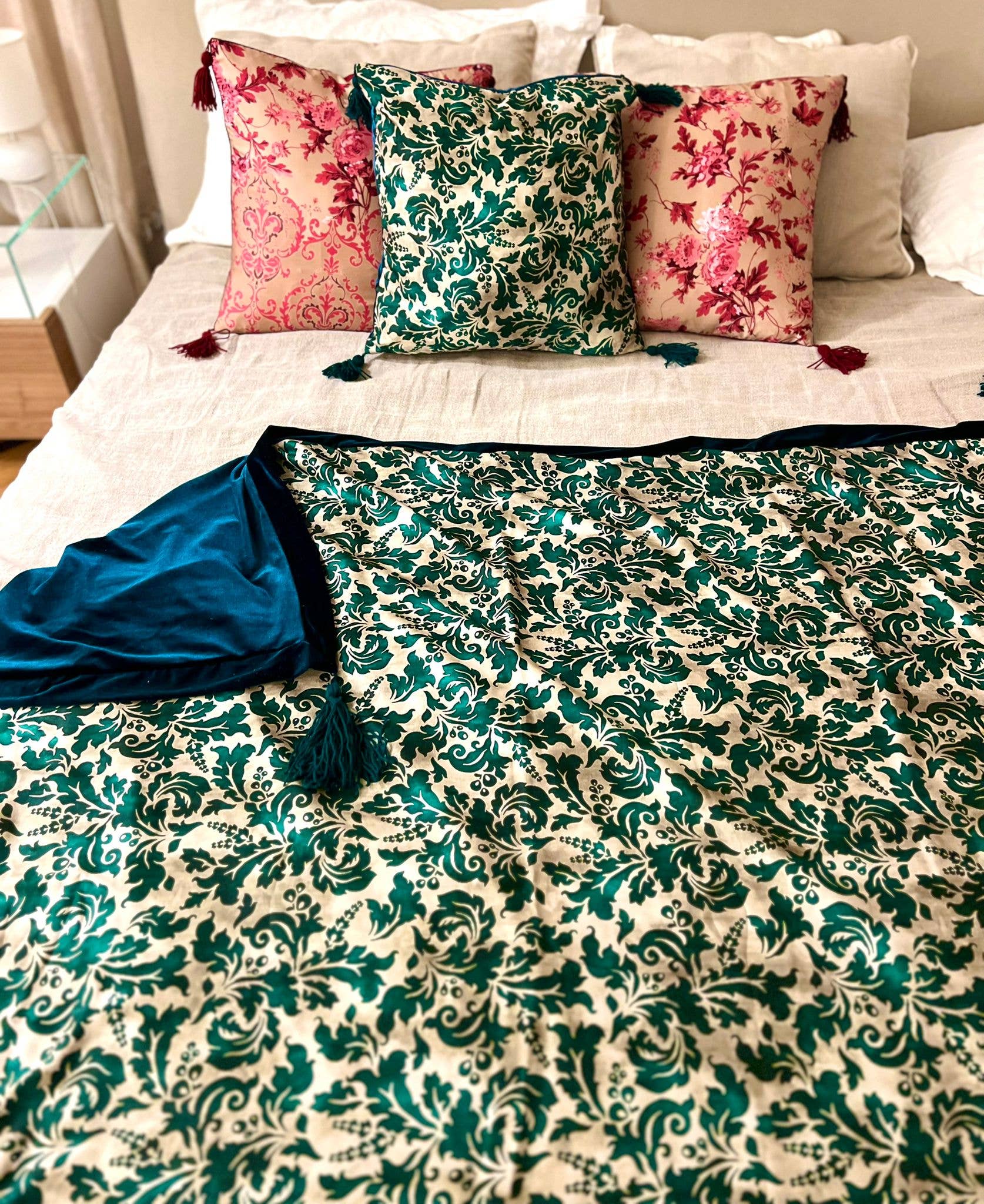 La Vie En Rose has designed a new Home Design line with textures that are inspired by the La Vie En Rosalia capsule inspired by the Sicilian mood and reflect its icons through folk, baroque and arabesque prints. The blankets and pillows are in a “double” version, on the one hand the warm and precious velvet, on the other the satin with exclusive prints for a comfortable and at the same time cozy and contemporary environment. The tassels in the same color add elegance and preciousness. The multicolor Folk print, with a strong character due to the satin part combined with blue velvet, creates an elegant and precious contrast. Discover it now!
