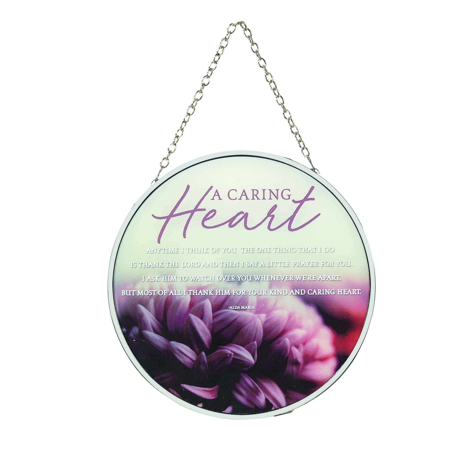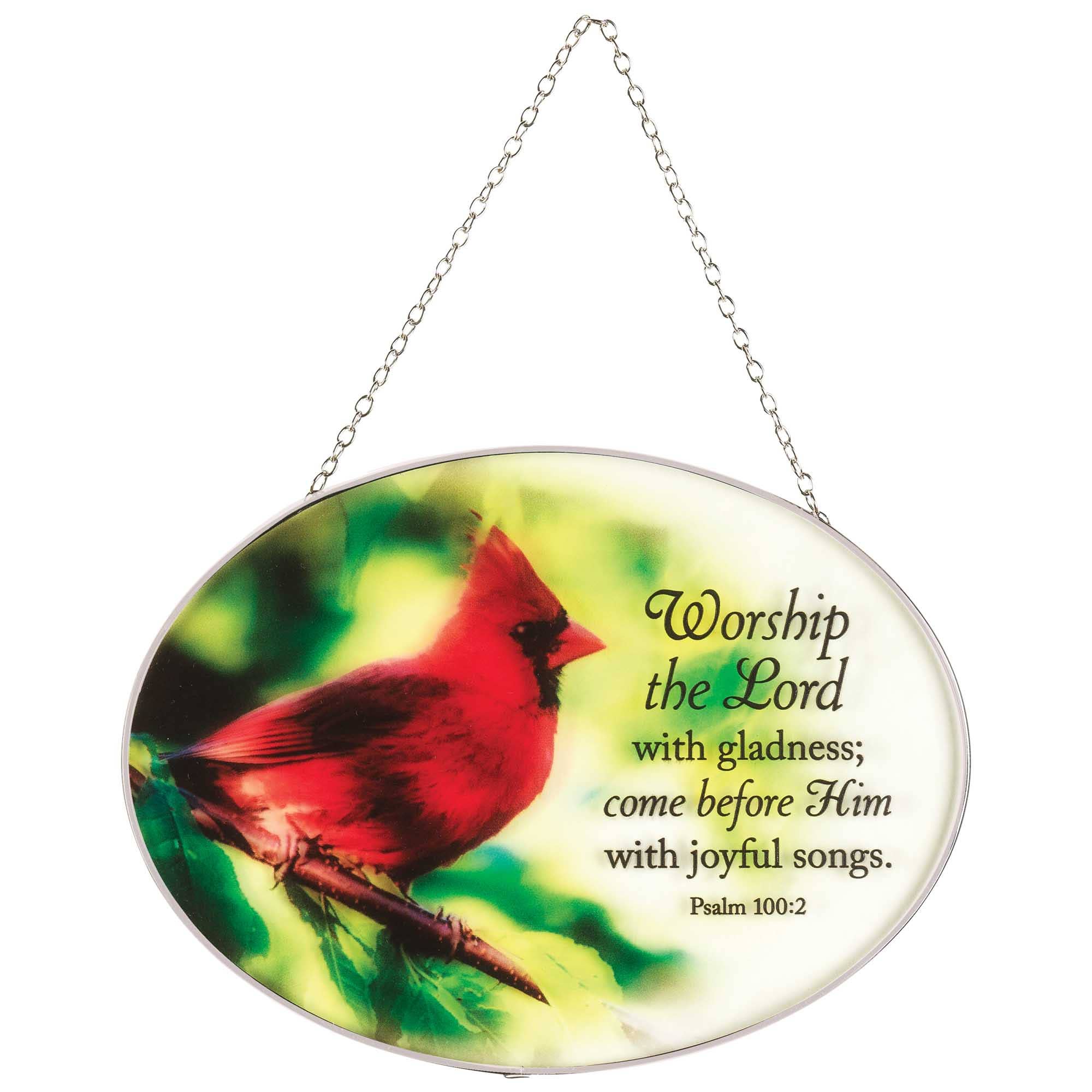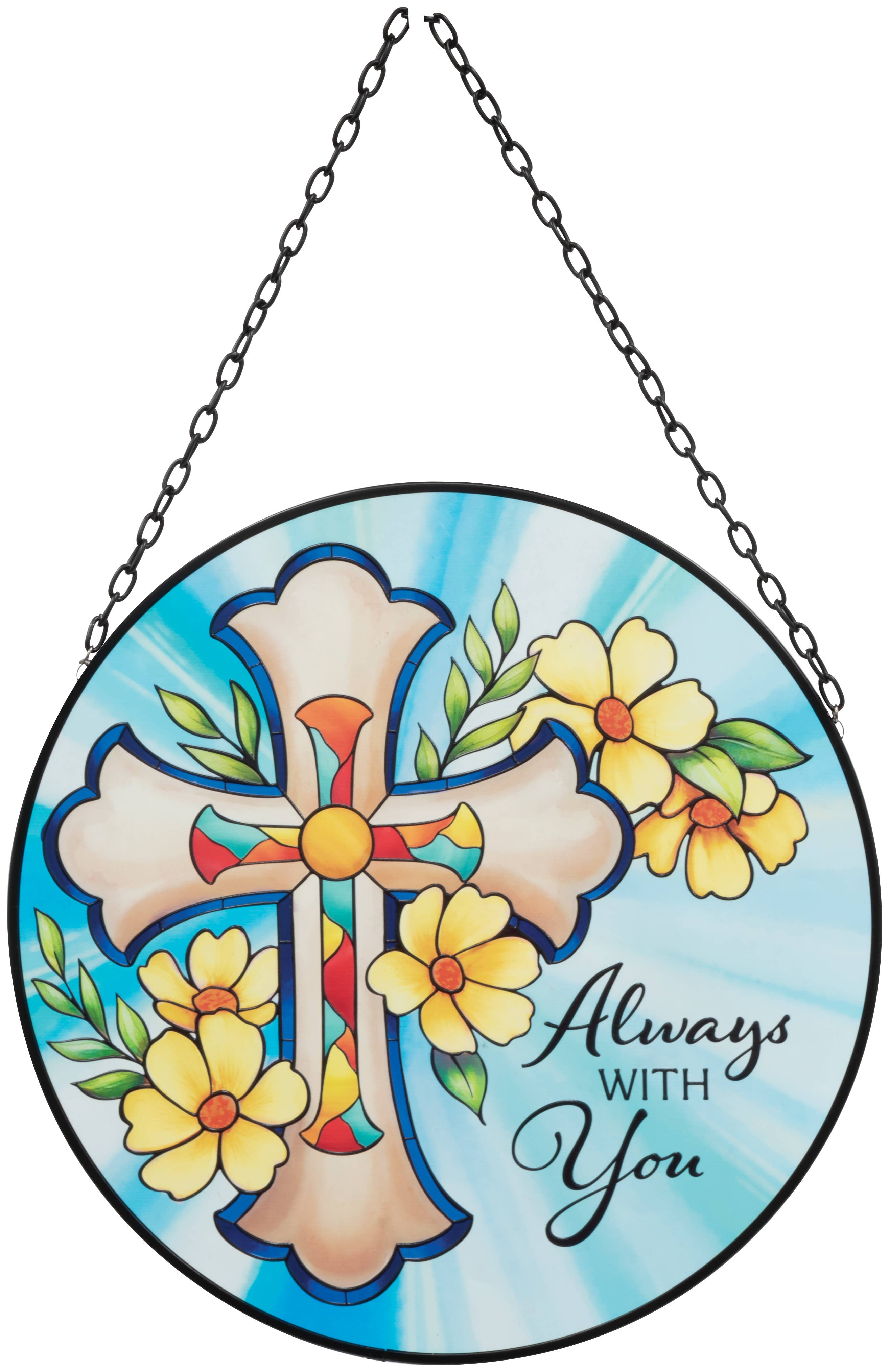 Welcome springtime with this oval shape suncatcher that shines with a colorful outline and Ephesians 2:10: For we are God's handiwork, created in Christ Jesus to do good works, which God prepared in advance for us to do. Size is 9 wide x 6 high. Finished with silver tone metal frame and hanging chain; clear suction cup included. Comes in a window box, all ready for gift giving.