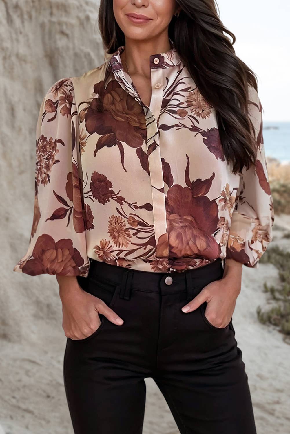A printed woven top featuring round neckline, long sleeve with smocked cuff and back neck button closure Details: Self : 100% Polyester Lining : 100% Polyester Size & Fit - Model is 5`9" And Wearing Size Small - Measurements Taken From Size Small - Approx. Length: 24"
