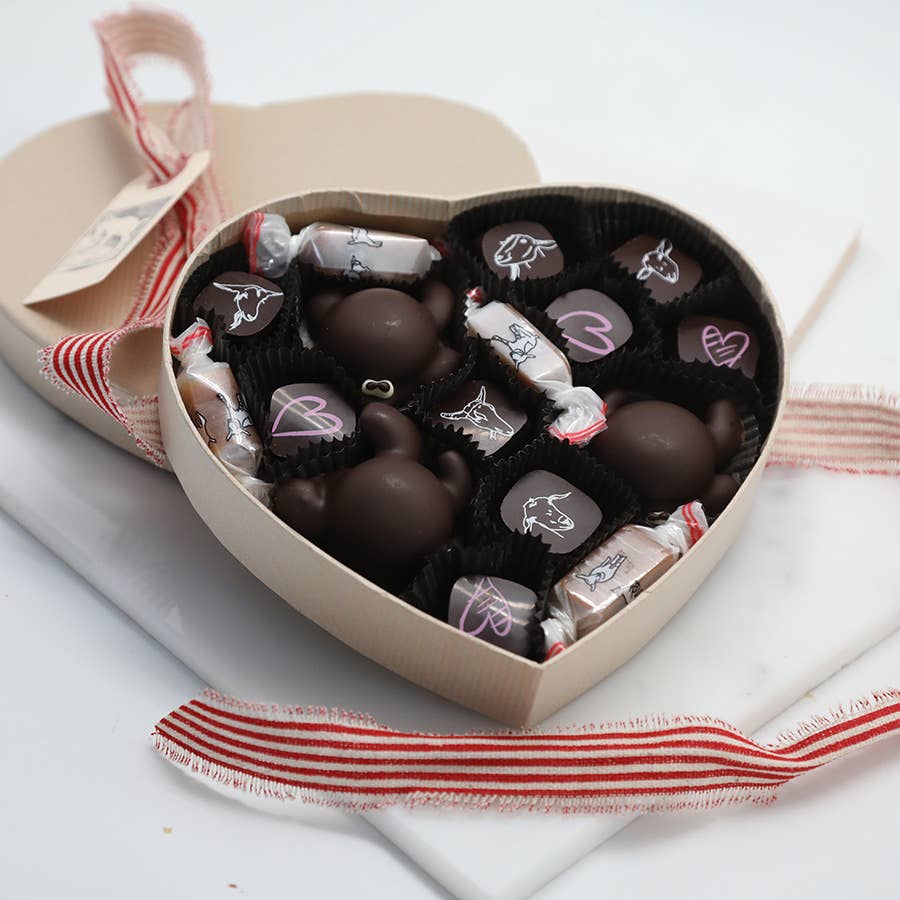Valentine's Day Special! Our award winning sea salt and vanilla farmstead goat milk caramels lovingly dipped in organic, fair trade dark chocolate. These are completely irresistible. Winners of a 2015 SILVER SOFI as well as a 2016 GOOD FOOD AWARD they already have a lot of accolades for their short life. ****Each caramel is topped with a cocoa butter impression--includes a mix of our goats and hearts. A little piece of art. They come in boxes of 6 or 12 pieces with a storybook pamphlet inside to accompany the drawings on the caramels. A superior gift if there ever was one. ***Please NOTE the 6 piece box has a clear top and the 12 piece box does NOT--it is in a craft paper box as pictured here. ***'Best By' stickers will read 4 months from the ship-date