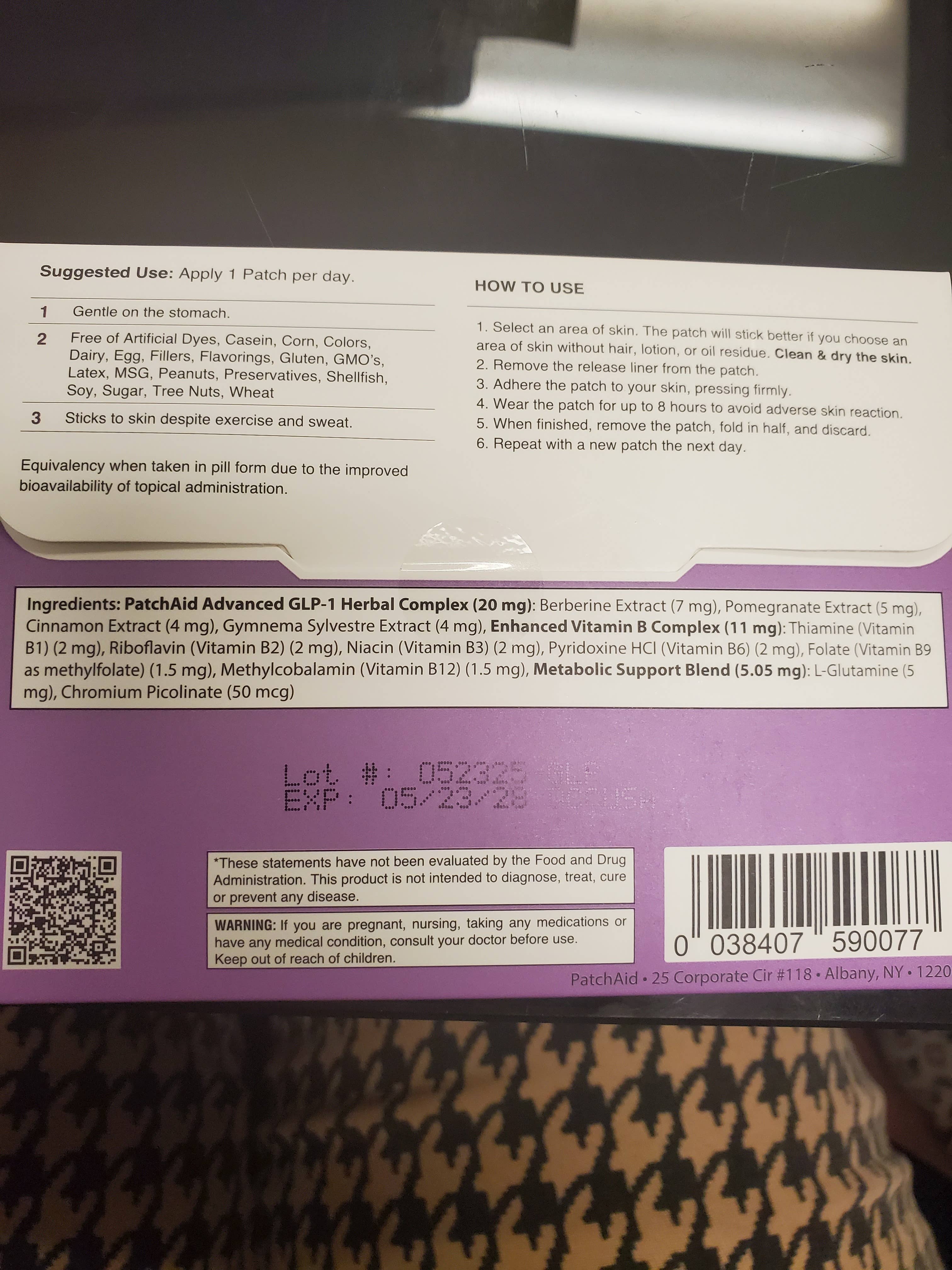 SKU: 0038407590077 Made in United States Ingredient Preferences: Gluten-Free and Non-GMO Ingredients: PatchAid Advanced GLP-1 Herbal Complex (20 mg): Berberine Extract (7 mg), Pomegranate Extract (5 mg), Cinnamon Extract (4 mg), Gymnema Sylvestre Extract (4 mg), Enhanced Vitamin B Complex (11 mg): Thiamine (Vitamin B1) (2 mg), Riboflavin (Vitamin B2) (2 mg), Niacin (Vitamin B3) (2 mg), Pyridoxine HCI (Vitamin B6) (2 mg), Folate (Vitamin B9 as methylfolate) (1.5 mg), Methylcobalamin (Vitamin B12) (1.5 mg), Metabolic Support Blend (5.05 mg): L-Glutamine (5 mg), Chromium Picolinate (50 mcg) Product Language: English Weight: 22.68 g (0.8 oz) Dimensions: 14 x 0.5 x 10.7 cm (5.5 x 0.2 x 4.2 in) EAN: 0038407590077 Packaging: Reduced Production: Low-impact transport