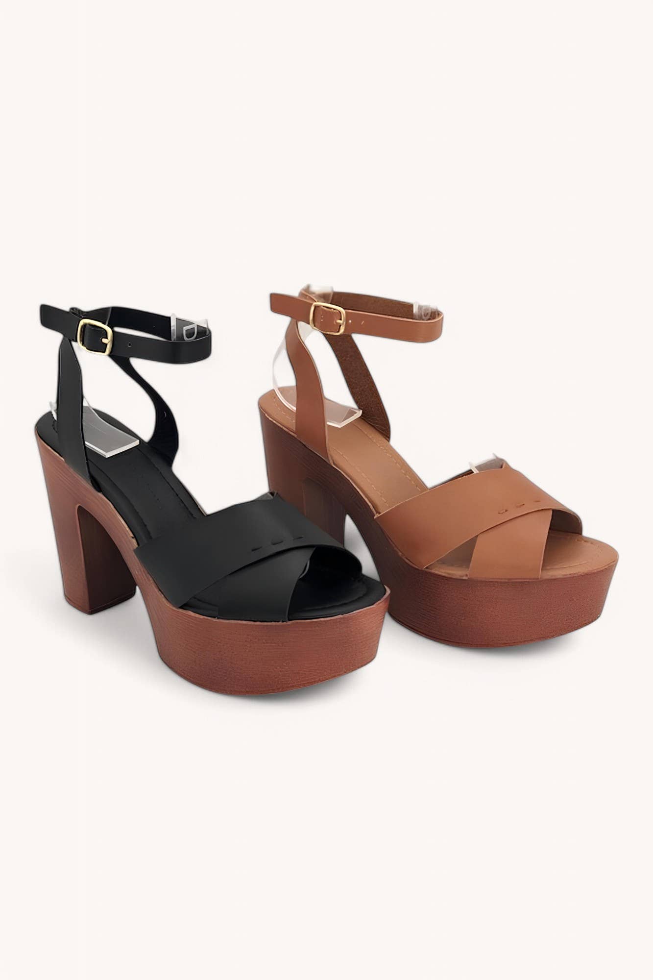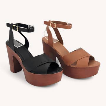 Leather upper Adjustable buckle closure Open toe 1.75" covered platform 5.25" covered heel 6 - 10 US Made in Brazil