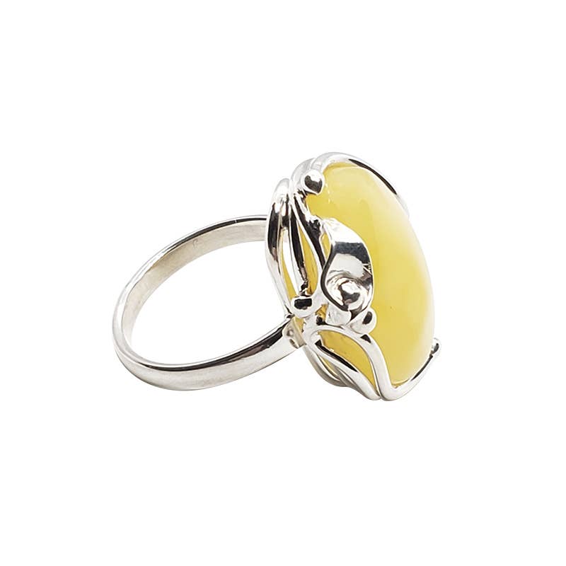 Butterscotch amber sterling silver ring. Oval-shaped amber stone is set in .925 sterling silver. Genuine Baltic amber.