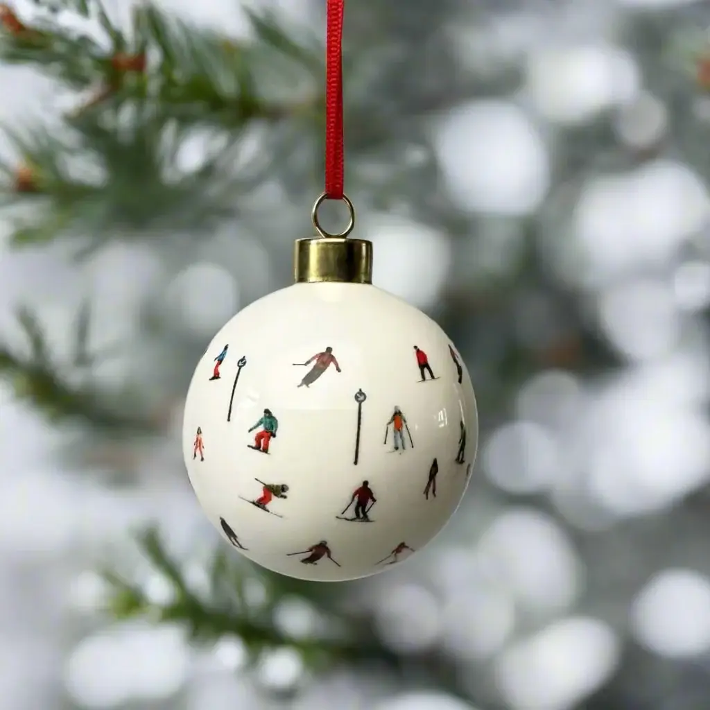 Colourful Illustrations of skiers and snowboarders on beautiful white fine bone china ornaments. Certain to bring back memories of exhilarating days on the slopes. Available as singles in a luxury gift box.