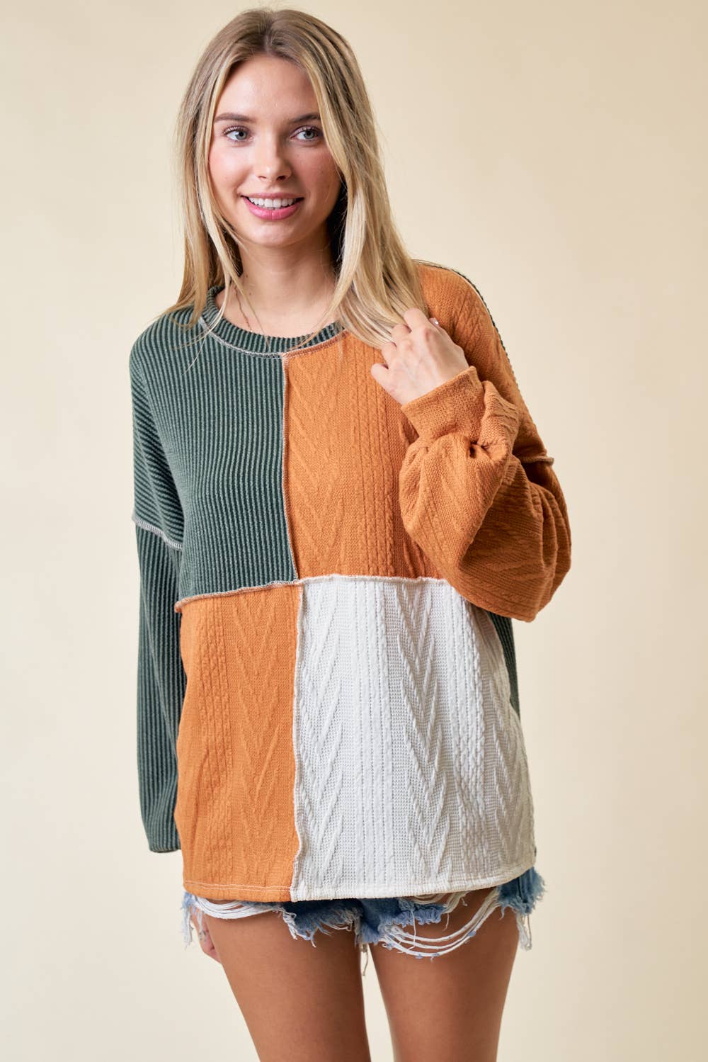 ETK-7955 Hacci Brush Color Block Casual Top