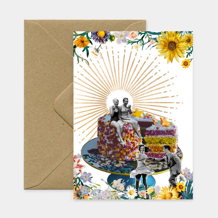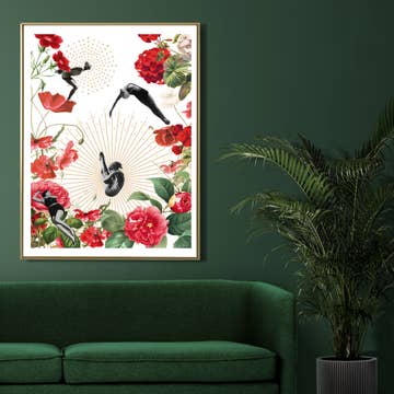The Bathers poster is a retro poster of a trio of female divers in the middle of geraniums, carnations and red camellias. A three-stage plunge with a central bouquet surrounded by a ray of gold. A captivating scene to decorate your living room or bedroom. An illustration printed in France on 250g matte white paper with rays in gold ink. The poster is sold in a white transparent window pouch with the hot gold logo, ideal for in-store presentation, perfect for making a gift.