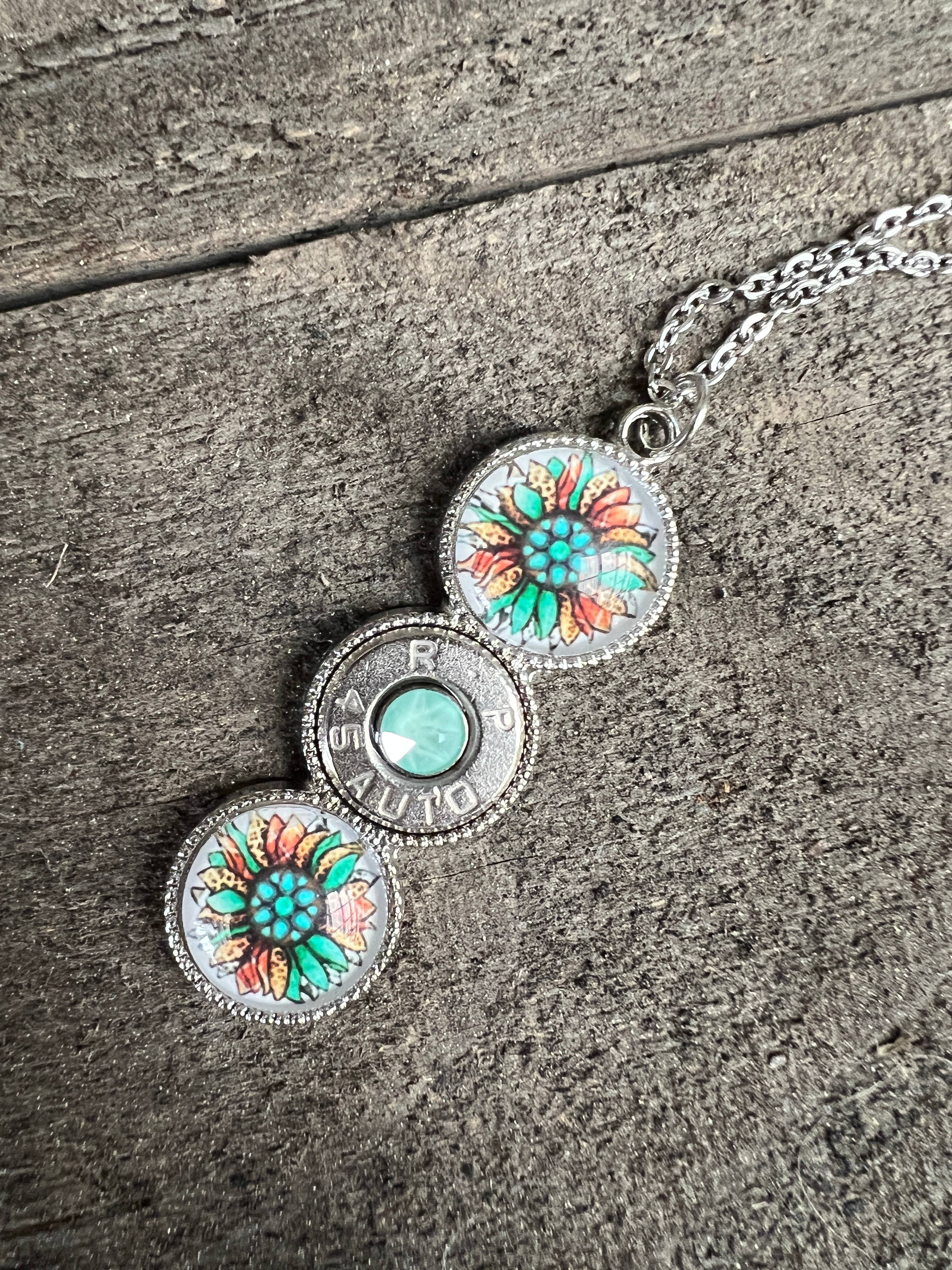 This is a 45 Caliber pendant and is accented with a Swarovski crystal. This necklace is approximately 2.5" in diameter and comes on an 18" Chain. Silver plated over brass, lead and nickel free