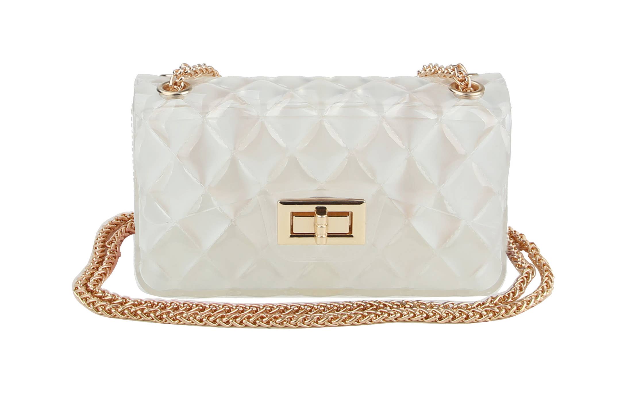 * Clear Pearl Stud Bucket Bag W/Chain Tassle * 7W*7H*5D * PVC, Mixed Metal Introducing the "Clear Pearl Stud Bucket Bag W/Chain Tassle" – a stunning clear bucket bag adorned with elegant pearls and a chic gold chain tassel. This accessory from H&D Accessories is perfect for adding a touch of sophistication to any outfit, making it a must-have for fashion-forward individuals.