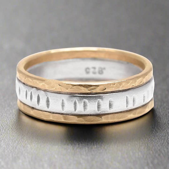 Make a bold statement with our Gold Bar Band, featuring a sleek 14kt gold bar securely held by a sturdy hammered sterling silver ring band. This contemporary design showcases striking mixed-metal contrast while delivering substantial presence on the finger. Measuring 6mm in width and 2mm in thickness, this band combines elegance with durability for everyday wear. The hammered sterling texture adds artisan character while the smooth gold bar provides refined contrast. Perfect for those seeking modern, architectural jewelry with masculine appeal. Handcrafted from recycled metals in our Philadelphia studio. Specifications: * 14K gold bar centerpiece * Hammered sterling silver band * 6mm width, 2mm thickness * Substantial weight construction * Mixed metal design (gold & silver) * Handcrafted from recycled metals * Made in Philadelphia