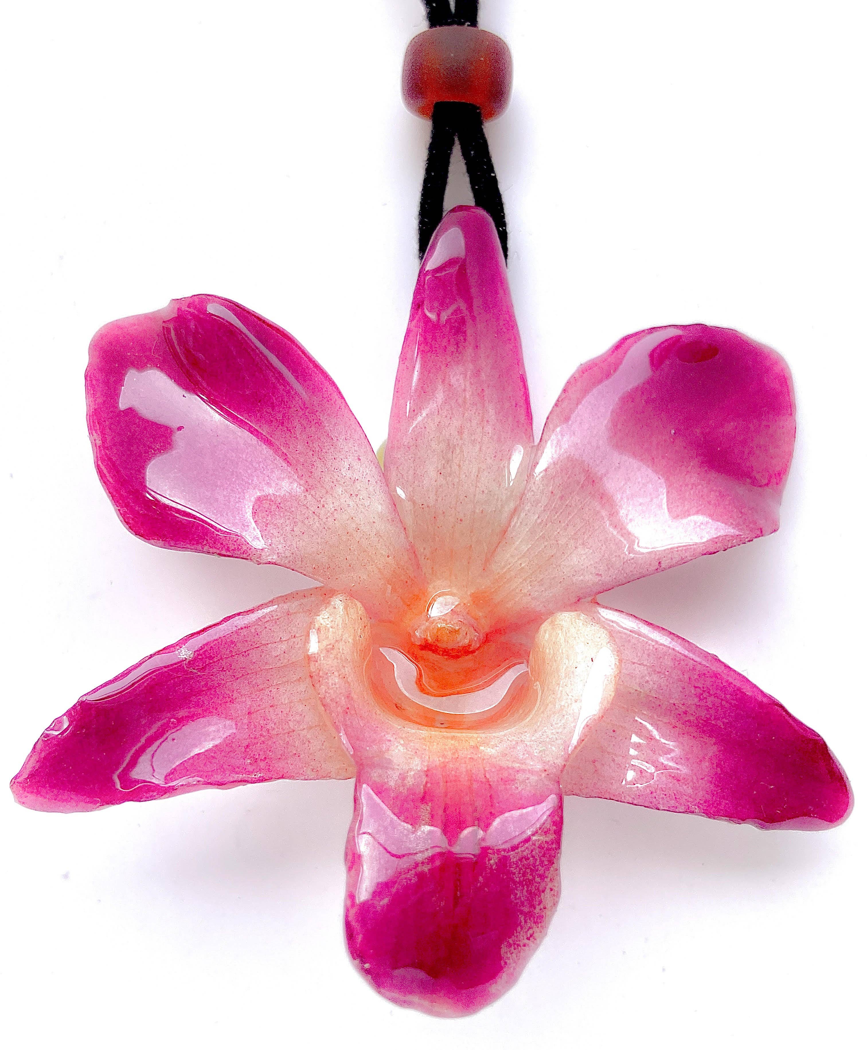 Purple Catleya Orchid necklace on suede cord or silver rope. Flower size about 2.75 inches (70 mm) high and 2.75 inches (70 mm) wide. Size will vary from flower to flower. Use sliding glass beads on suede cord to adjust as necklace or choker, or choose 16" the silver rope option.