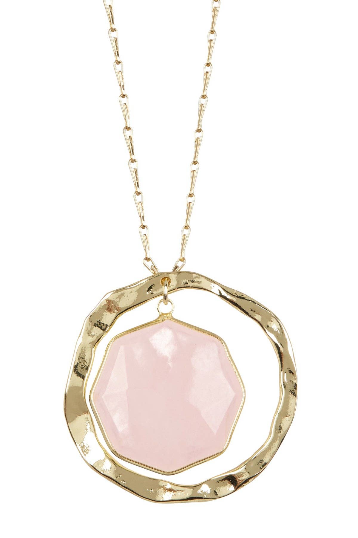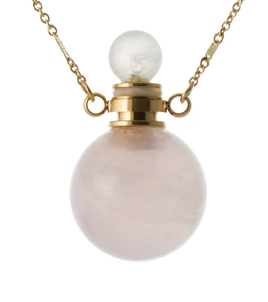 Rose quartz symbolizes universal love and harmony. This necklace adds a symbolic touch to the wearer. Product Details: Gold tone necklace with rose quartz pendant Fill with your favorite essential oils Necklace: approx 16" length with 3" extension Pendant: approx. 1" in diameter; sizes may vary due to use of natural stone Clasp: lobster