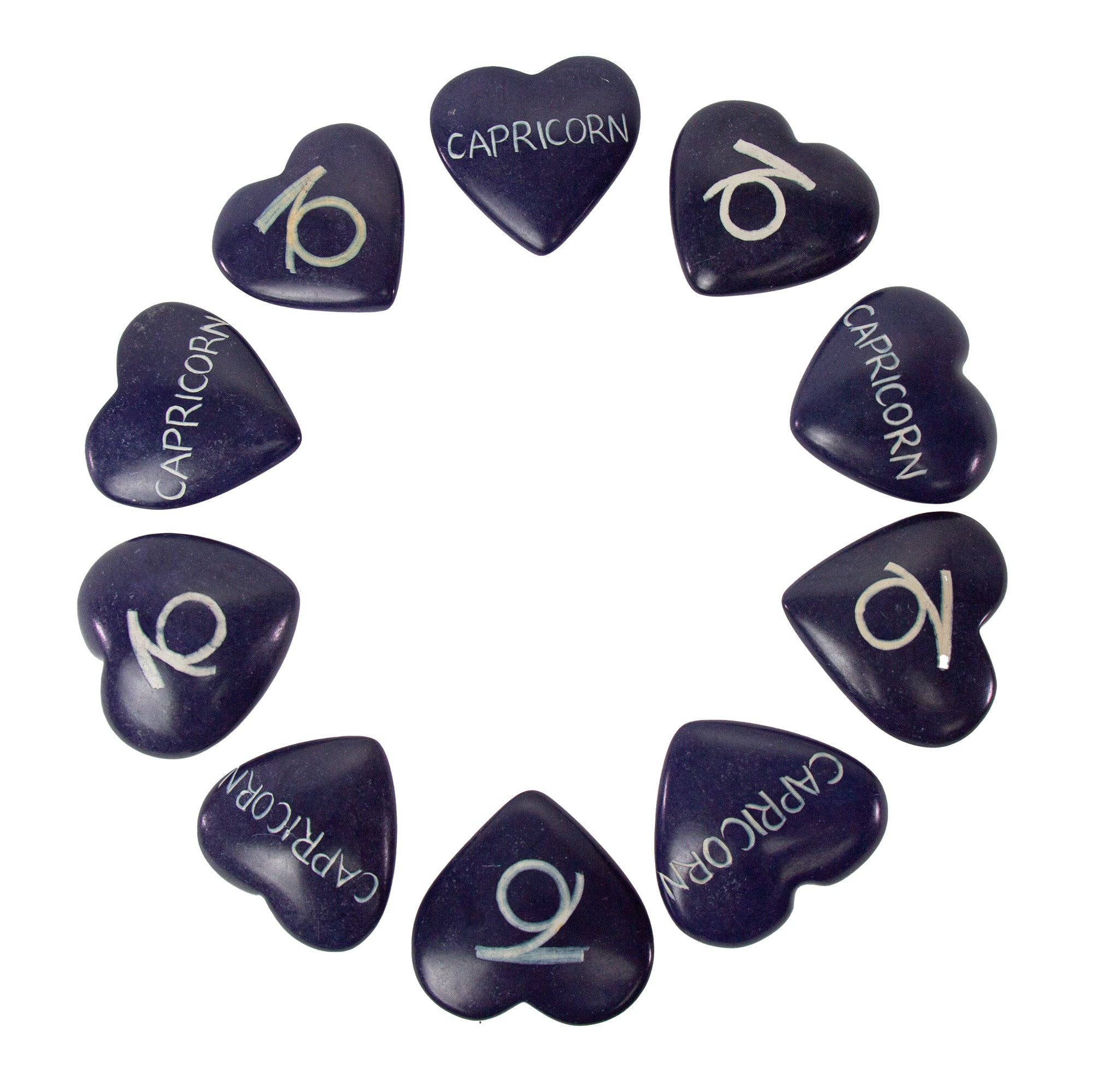 Hand-carved from a single piece of Kisii soapstone by African artisans, the soapstone hearts are brightly painted and feature the zodiac sign on one side and the zodiac name on the other. A great giftable for a birthday or as keepsake reminder to share the love with your family and friends.  * Measures approximately 2.25-inches and under 1 inch thick. * Hand-painted. * Soapstone is a soft, natural mineral from the earth, making it easy to carve into many forms. Handle with care to avoid breakage. * Each piece has gone through multiple stages of sanding and waxing, giving the soapstone a satiny finish. * Socially responsible products that empower consumers to purchase according to their values and help alleviate global poverty.Keywords: hearts, zodiac, display, tabletop, trinkets, birthday, gifts