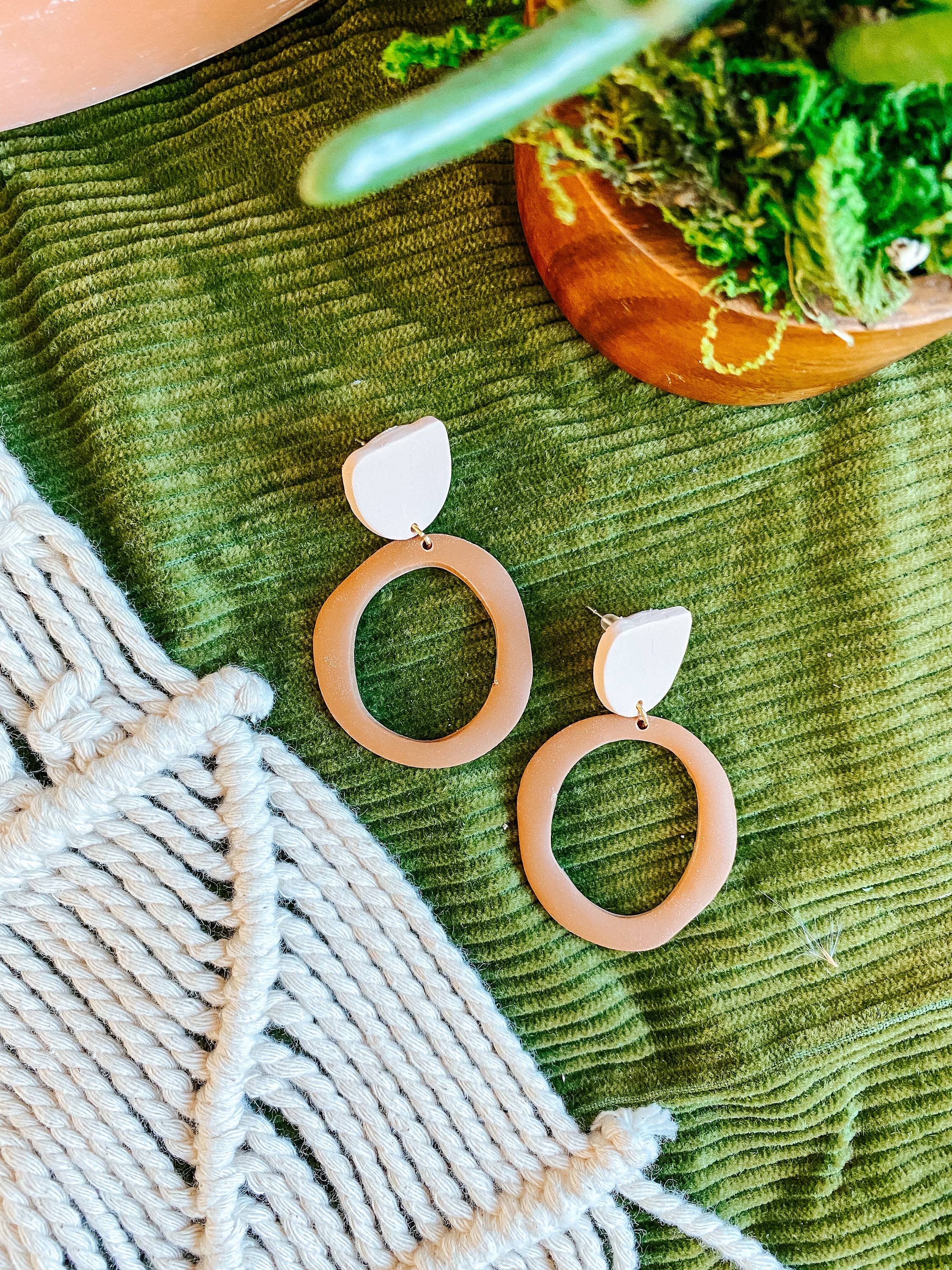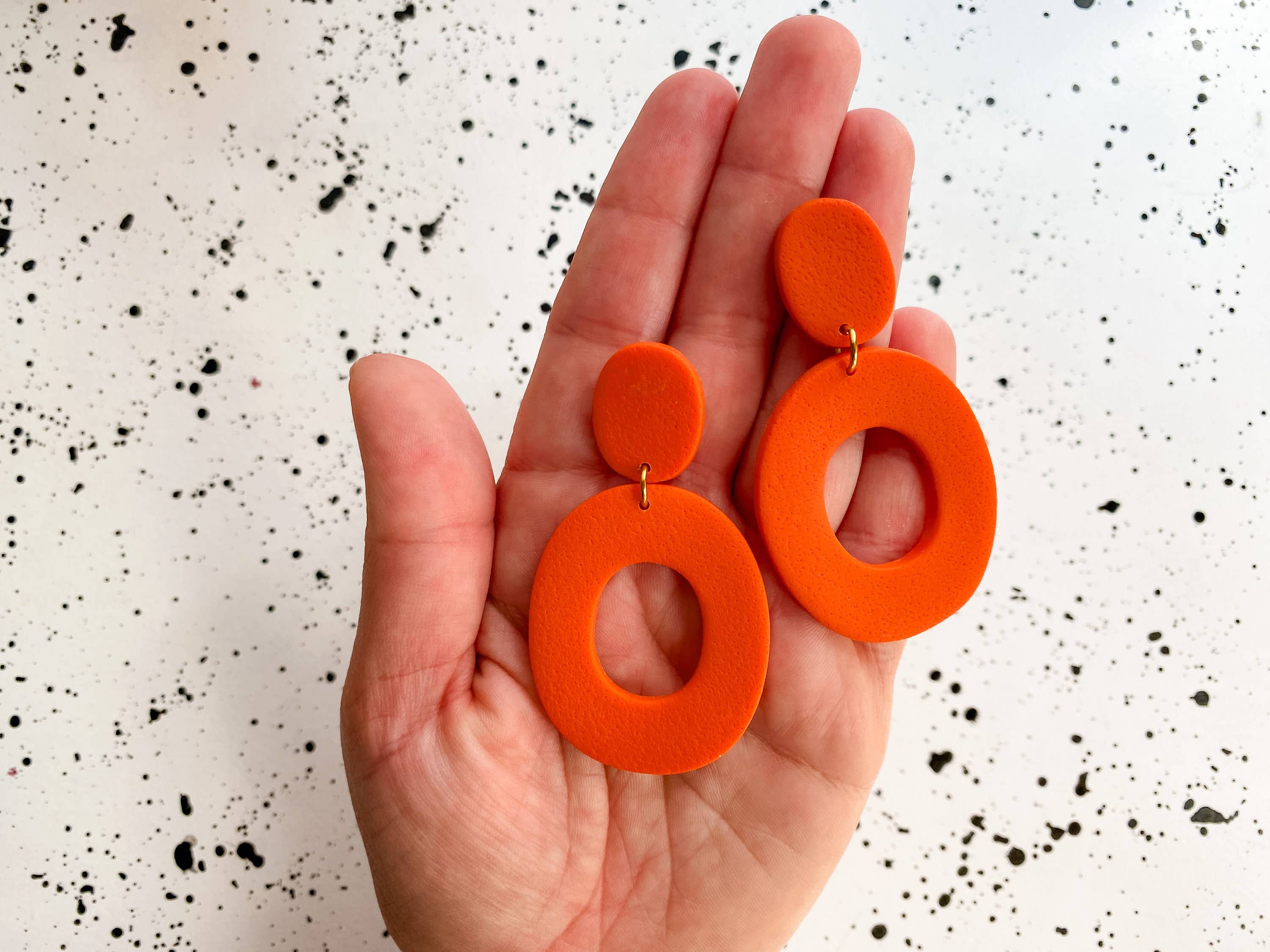 Boho Orange matte hoop earrings, modern earrings, medium size earrings, Polymer Clay Earring, Pumpkin Orange, Fall fashion, 70s Nostalgia Boho matte orange earrings are vintage-inspired and perfect for a fall or holiday glam outfit. Pumpkin orange hoops with a beige top with an ivy texture make these earrings the perfect, classy style for an updo. -Lightweight (.3 oz). -Hypoallergenic earring backs for sensitive ears. -Durable + easy to clean. -Handmade -Small batch They are big enough to make a statement but lightweight enough to make you forget you're wearing them. These earrings are handmade out of polymer clay, meaning they are more delicate than metal earrings. They should be handled with care and kept free from oils, perfumes, and creams. If they get dirty, simply wipe them clean with a damp cloth. Each pair of earrings is handmade, so there may be slight variations from the product photo.