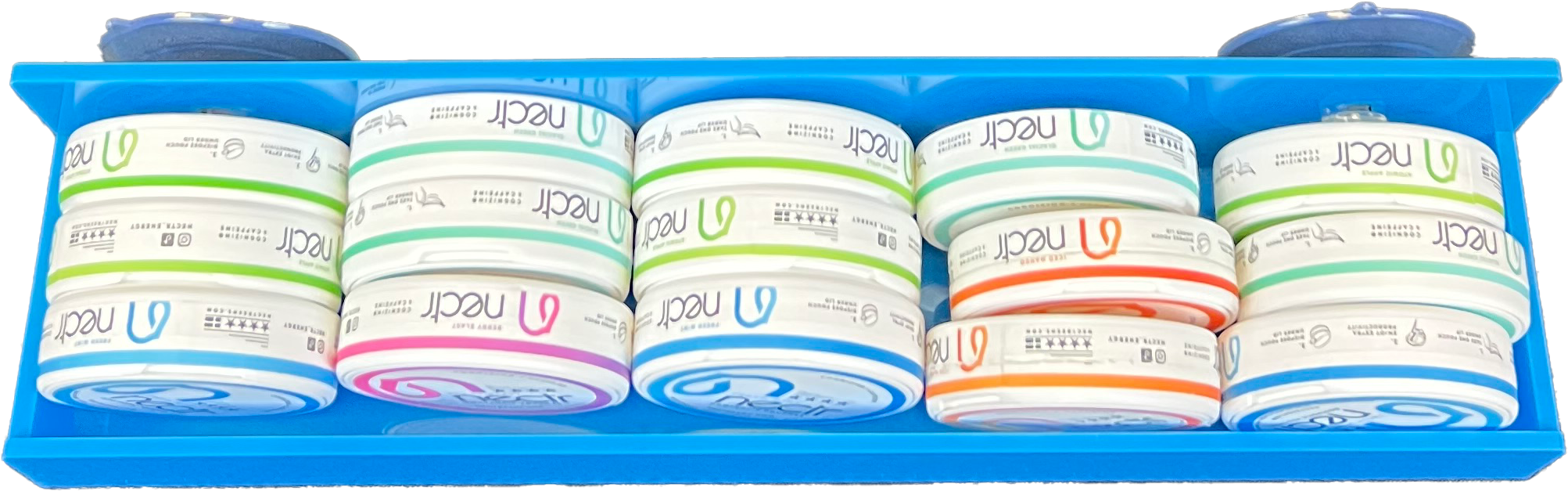 Sophisticated cans for oral pouches, nicotine pouches, and snus products. Crafted with expanded capacity and storage for used pouches. Each can is laser-engraved with various designs The display features 4 different design and color combinations.