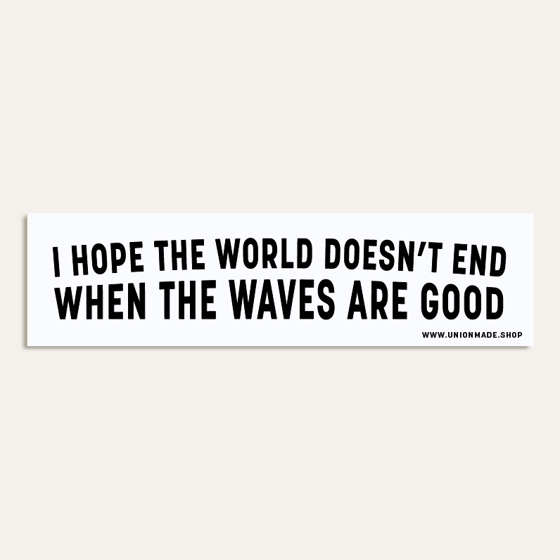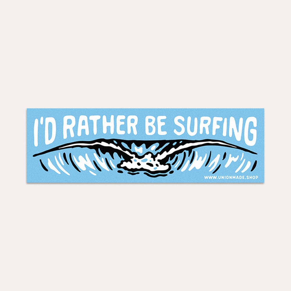 Our "Let's Go Surfing" bumper sticker is made from glossy, high-quality vinyl that holds up to the elements. It’s 9.5x3 inches, with white letters on a blue background—easy to spot and built to last. © Copyright Kamin and Sydney Tersieff, Union Made, 2025, All Rights Reserved. All images, designs, and lettering are copyrighted and cannot be stored, reproduced, or used without obtaining prior written consent from the owner.