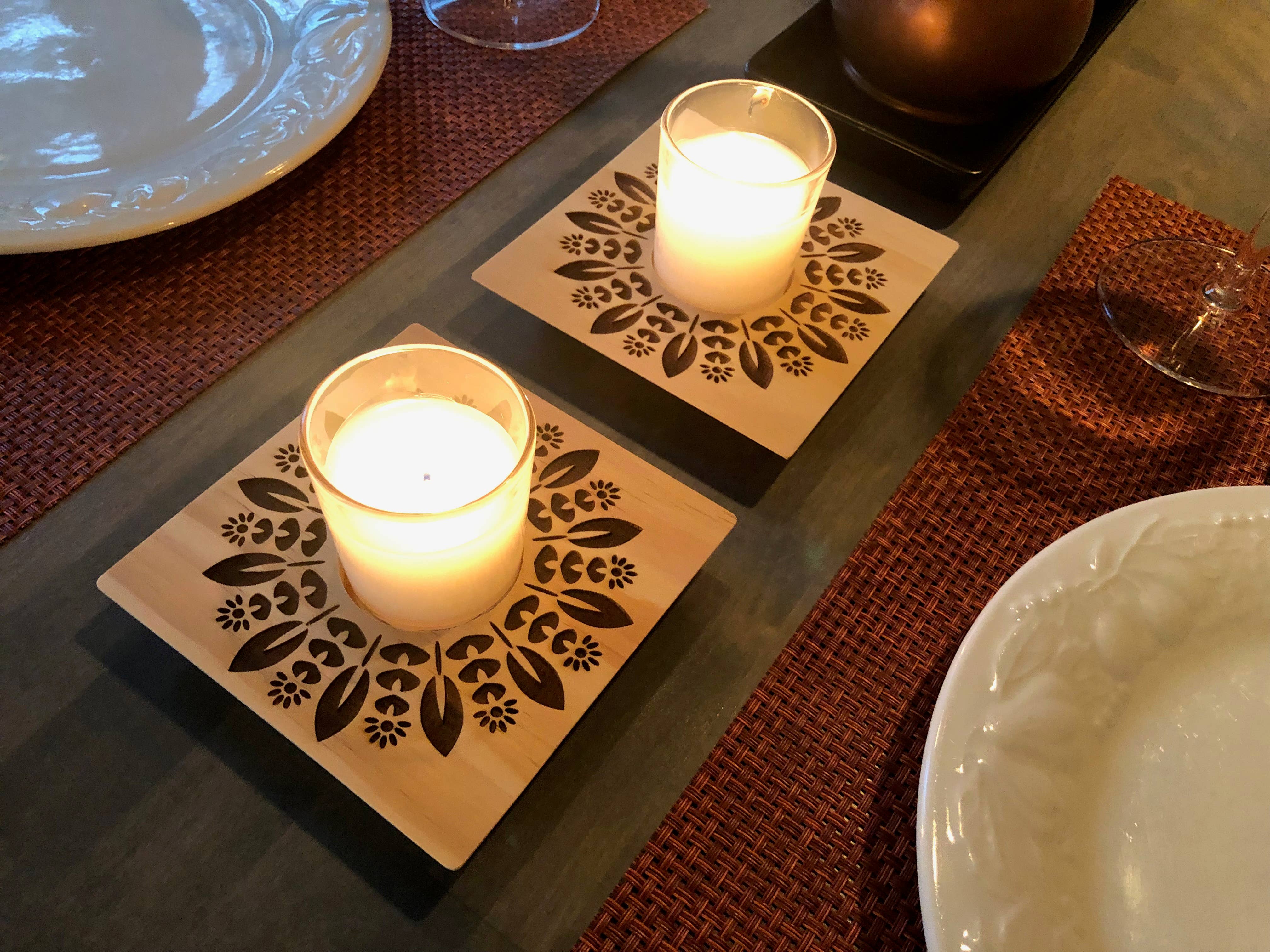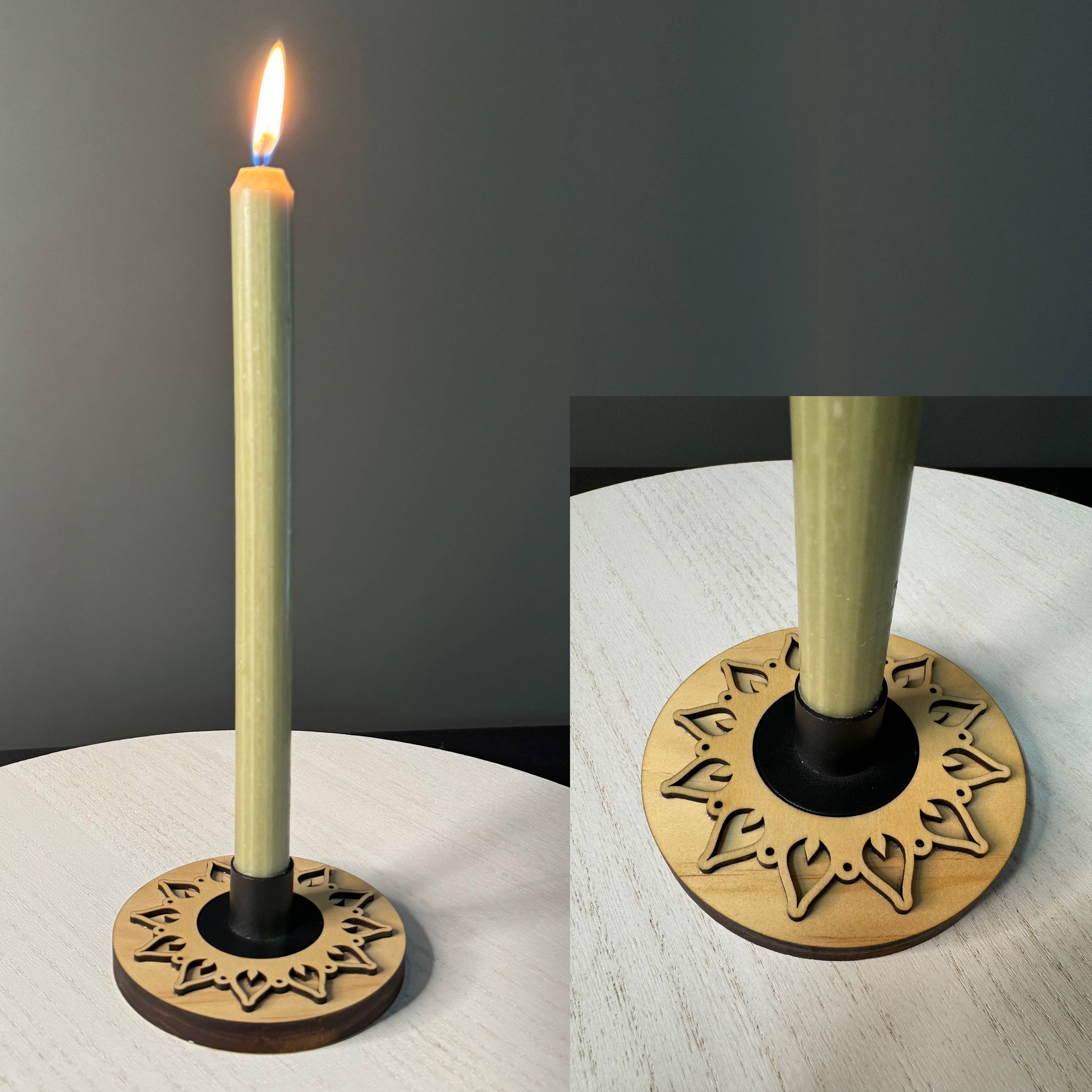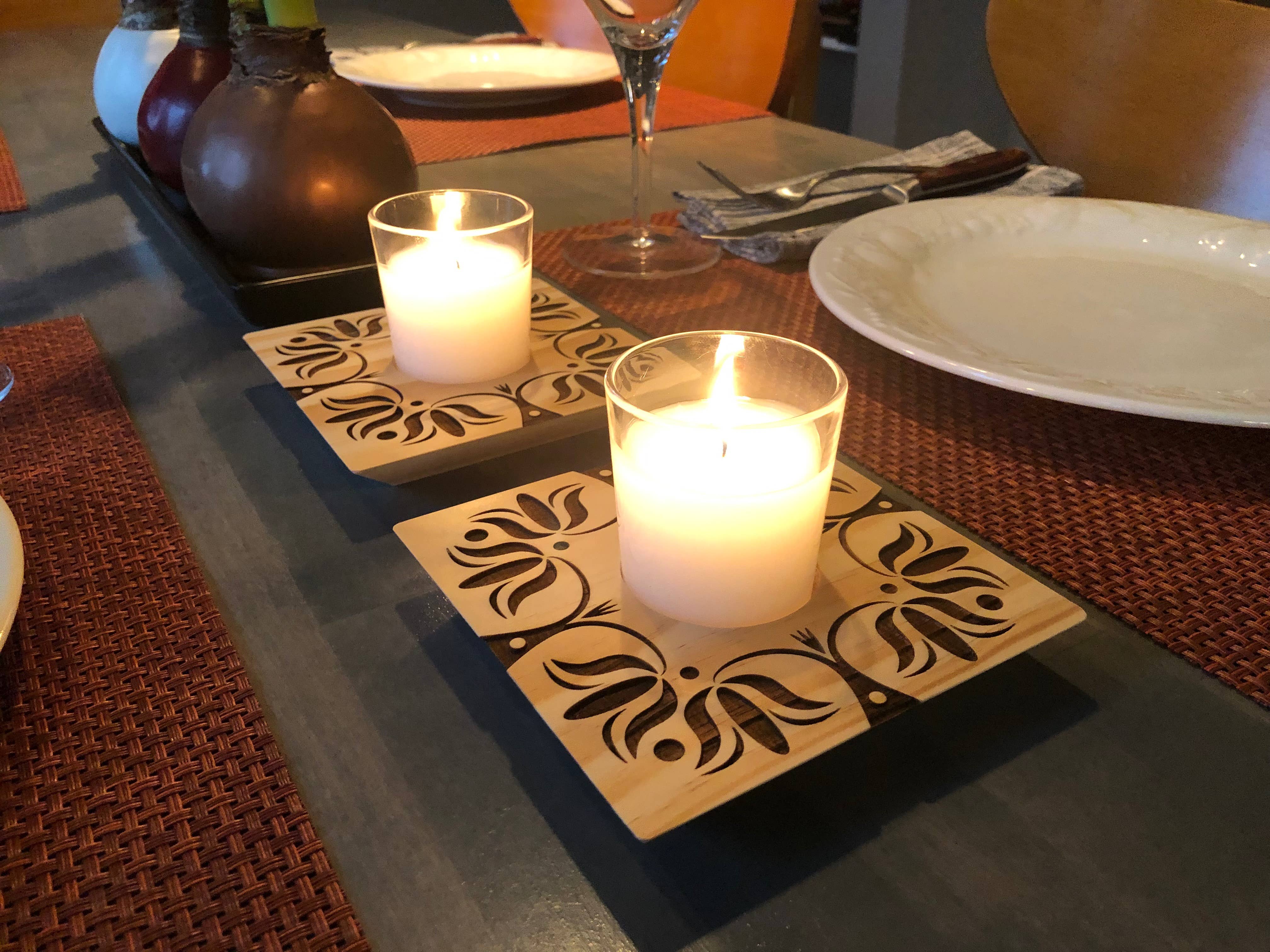 Wall-mounted votive candle sconce with glass. Made with solid Monterey pine and basswood plywood. Finished with a clear shellac sealer. D-ring hanger. Glass fits standard wax and LED votives. Candle not included. This product is made by hand in small batches in our Oregon workshop. All artwork and design is original – no AI or stock imagery is ever used. EACH SCONCE IS UNIQUE The natural beauty of wood shows through, and each example varies in color and grain. SPECIFICATIONS Wood base: Approx. 3.5"W x 4"D X 7.5"H Glass: Approx 2" W x 2.625" H