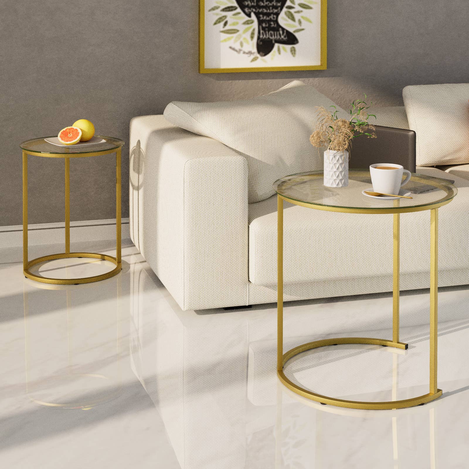 CONTEMPORARY DESIGN: Elevate your living space with our Modern Couch-Side End Table, a stylish and functional piece designed to complement your couch. CONVENIENT COUCH-SIDE PLACEMENT: The unique design allows the table to snugly fit alongside your couch, providing a convenient surface for snacks, beverages, or a laptop while you relax. C-SHAPE FOR CONVENIENCE: The unique C-shaped design allows the table to slide effortlessly under sofas or chairs, bringing convenience to your seating area. ROUND TABLETOP: The round tabletop provides a perfect surface for placing snacks, beverages, or decorative items. It's an ideal companion for your cozy moments. VERSATILE USE: The spacious tabletop is perfect for holding essentials, and the lower shelf adds extra storage or display space for books and decor. ROLLING WHEELS FOR MOBILITY: Fitted with smooth-rolling wheels, this end table becomes effortlessly mobile. Easily move it around to accommodate your changing needs or preferences. DURABLE CONSTR