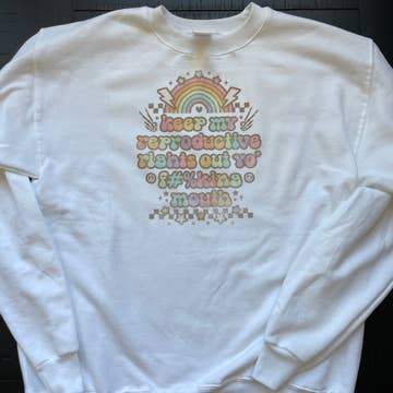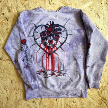 The B-Sides art from our Brightside collection on a unique purple 'color blast' tie-dye sweater - that never produces the same two prints twice!