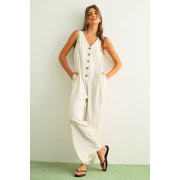 Contrast Adjustable Bow Back Cotton Gauze Jumpsuit - Cotton gauze soft fabrication - Adjustable lace straps that tie in a bow on the back - Sleeveless - Elastic banded waist - Chest pocket detail - Low back - Side slant pocket