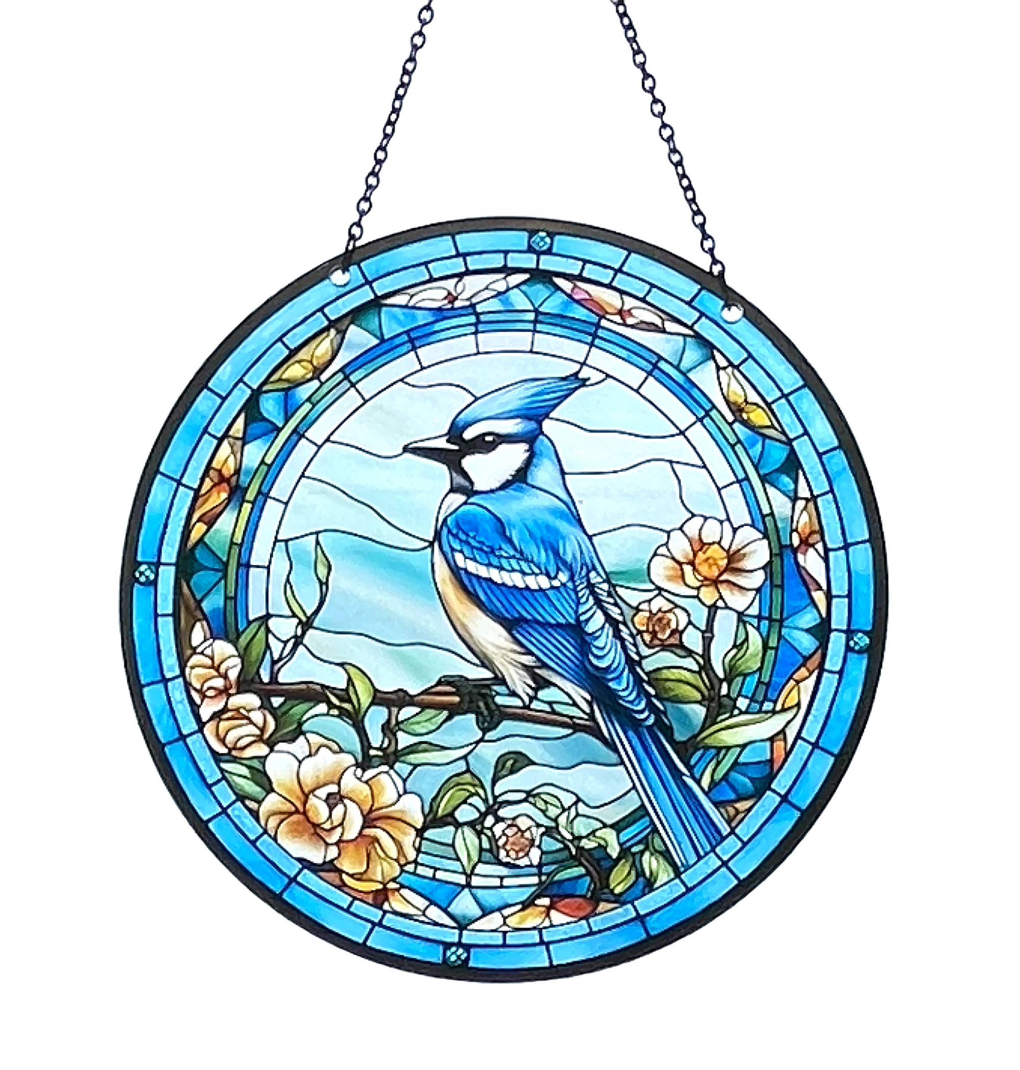 UV print on laser cut acrylic. Looks great in windows and on walls. 6 inch diameter. 8.5 Inch stainless steel chain included. Made in the USA in Finlayson, MN d'ears products are designed using original artwork from the company owners, from collaborating artists and photographers, or public domain works. The imaging process provides the richest color and sharpest images to bring depth and excellence to each product they make. Each piece is one of a kind.