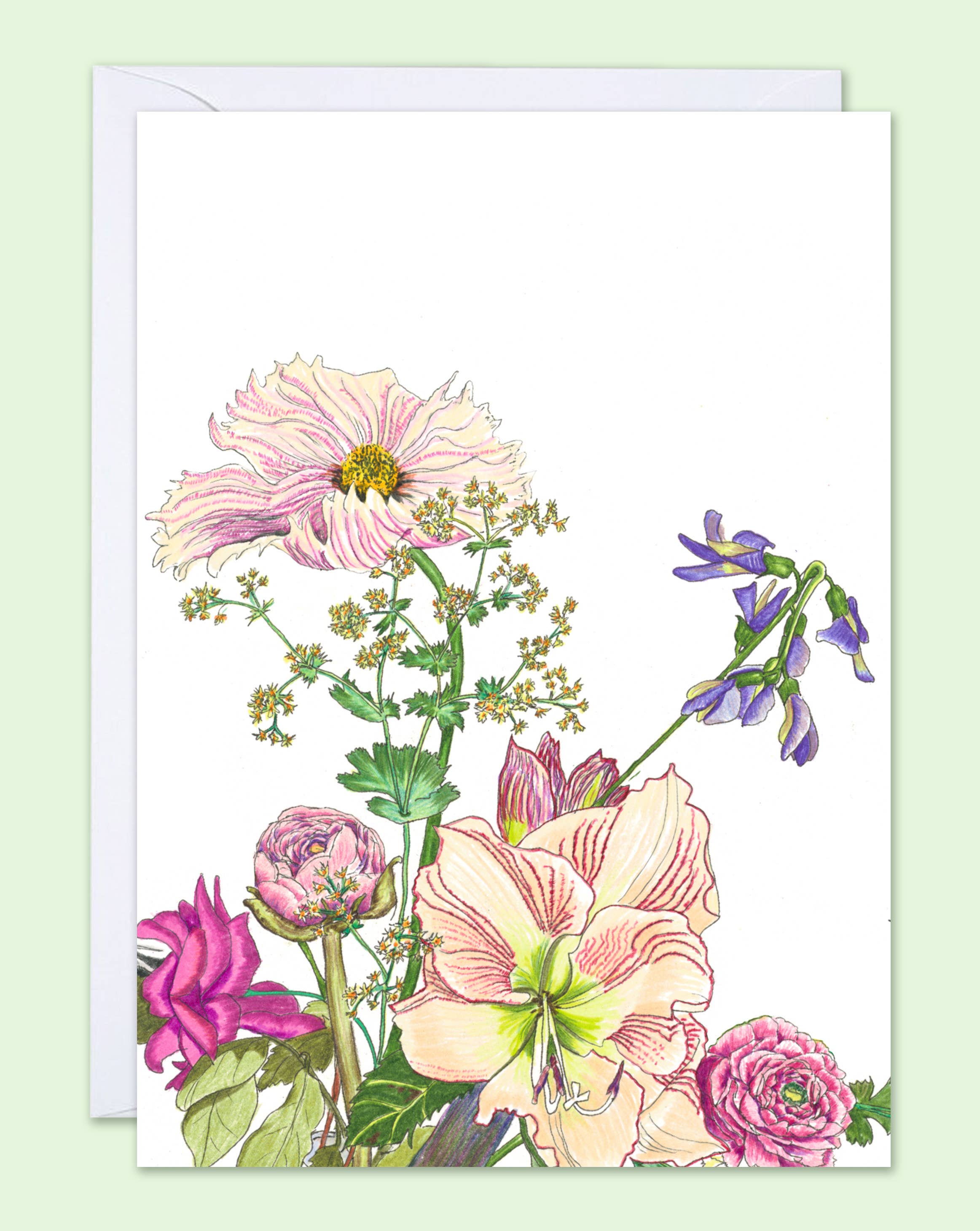 Our 'Winter Holiday' colored pencil illustration by Westport artist Kerstin Rao graces our newest greeting card. Flowers are Ranunculus, Baptisia, Wild Daisy, Columbine, and Cosmos. Vivid Cottage cards are designed to become keepsakes, carrying the private messages of customers to their loved ones in a beautiful form. Our stationery is completely produced in Connecticut, from the flowers grown and sold at a farmer's market to drawing the illustrations; from the exceptional digital scanning to the fine printing at a local shop with international reach.