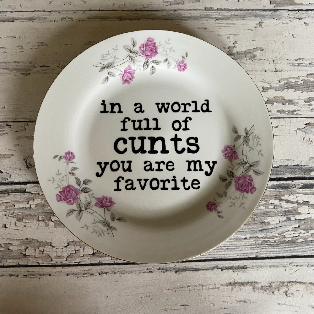 Vintage Swear Plate 51 1/2 inch round Add a bold twist to your decor with these one-of-a-kind Vintage Swear Word Plates – where classic charm meets cheeky attitude! Each plate is a genuine vintage find, lovingly upcycled with high-quality vinyl lettering featuring your favorite (and most expressive) swear words. Whether you hang them on your wall, display them on a shelf, or gift them to your sassiest friend, these plates are guaranteed to spark laughs and conversation. Important Note: These plates are for decorative purposes only – not food-safe. Keep the sass on the wall, not on the dinner table! Details: Authentic vintage ceramic plates (styles vary – that’s part of the charm!) Hand-applied vinyl lettering with strong adhesive Swear words and phrases vary from mild to WTF! Ready to hang or display Each plate is unique – no two are the same! Want a custom phrase or a specific color scheme? Message me – I love custom orders! Give your space a little vintage vibe and a lot of attitude. Because life’s too short for boring walls.These unique pieces are crafted from authentic vintage plates, lovingly upcycled to give them new life and charm. Each plate has its own story—some dating back decades—and may show slight signs of age, such as gentle wear, faint crazing, or minor imperfections. These characteristics are part of their vintage nature and only add to their one-of-a-kind appeal. Please note: Due to their vintage origin, no two plates are exactly alike. Expect small variations in color, pattern, or finish.These unique pieces are crafted from authentic vintage plates, lovingly upcycled to give them new life and charm. Each plate has its own story—some dating back decades—and may show slight signs of age, such as gentle wear, faint crazing, or minor imperfections. These characteristics are part of their vintage nature and only add to their one-of-a-kind appeal. Please note: Due to their vintage origin, no two plates are exactly alike. Expect small variations in color, pattern, or finish.