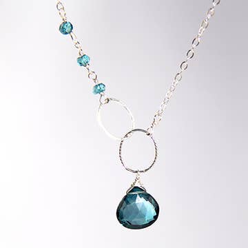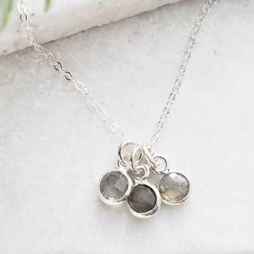 3 Meaningful Stones to bring together Kind, Loving, Strong Aquamarine- is the stone of courage Labradorite- provides balance Quartz- strength and power Metal Sterling Silver chain. Length 18" Stones 7,10,12mm Handmade in Connecticut, USA