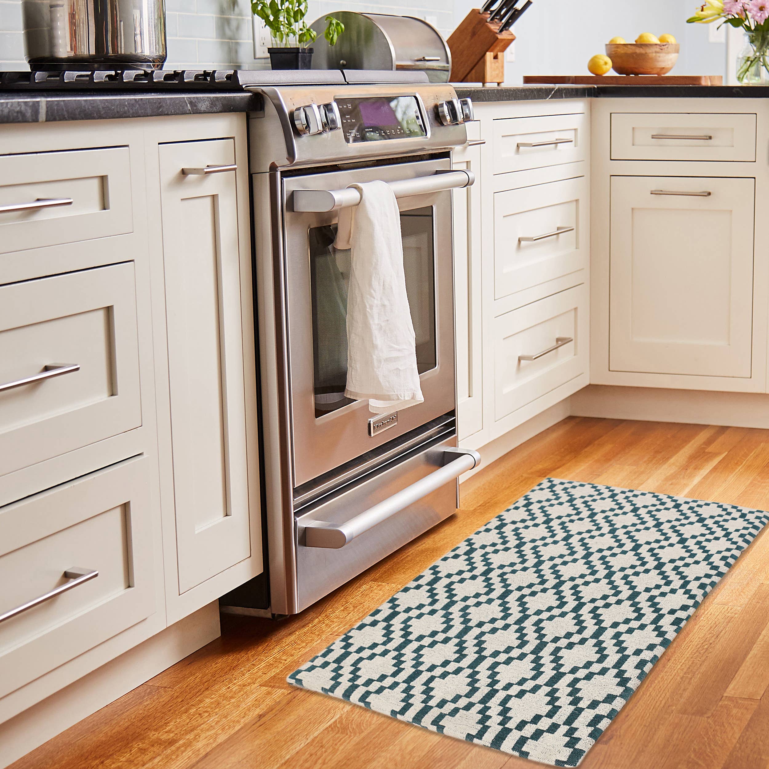 Spice up your kitchen with this beautifully crafted, comfortable anti-fatigue mat. We designed these anti-fatigue mats to provide maximum comfort, while not cutting any corners on style and durability. Crafted with the highest quality polyester, this kitchen mat will be sure to last you for years to come. Cotton canvas backing to insure durability. Made in India.