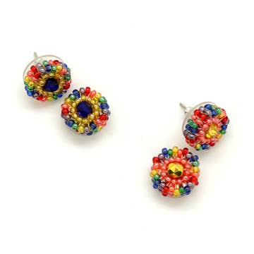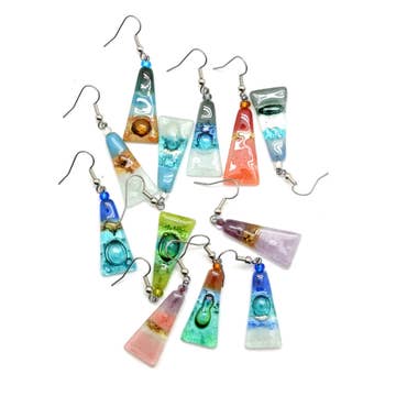 Triangle shaped fused glass earrings. Each piece of glass is hand-cut. Each will mold and bubble differently when heated in the kiln. Dangle 1-1/4", width 1/2". Made with fused glass, glass beads and surgical steel ear wires. Fair Trade verified Ships in assorted colors of the season. Please look at all of our photos to see examples of our work. If you have questions, please ask. If we're between seasons, we can typically ship assortments with appropriate colors.
