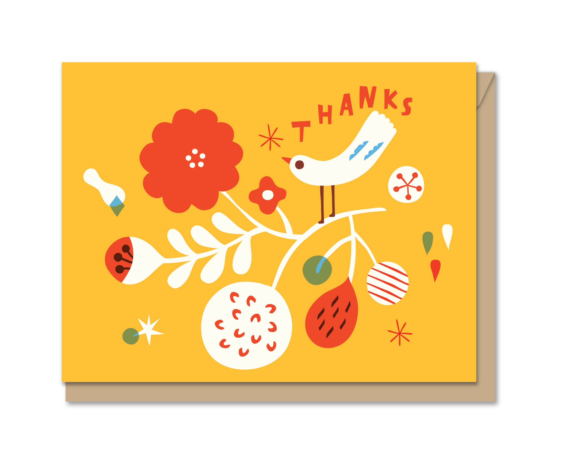 A2 (4.25” x 5.5”) card. Blank inside. Printed on natural white cardstock and individually packaged with a matching envelope in a clear plastic sleeve.