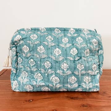 Bring along a fun splash of color and pattern on your next trip! These block printed pouches are the perfect accessory for storing toiletries, cosmetics and jewelry, either on the go or perched on a dresser at home. These also make a wonderful gifting item for birthdays, graduations and other special occasions. A pouch can be gifted on its own or filled with smaller items inside such as jewelry, candy, beauty products, etc. The outer layer is made up of quilted, block printed cotton fabric. Inner layer is lined with water-resistant plastic. Zipper closure with decorative tassel trim. * Size: 10" long x 6" high x 5" wide * 100% cotton with plastic inner * Hand Block Printed by artisans in Jaipur, India.
