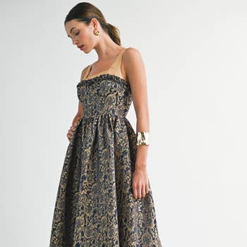 An ankle-length trapeze dress with corded embroidery lace detailing and sheer lace skirt insets. The vertical seamline structure creates an elongating, flattering effect throughout the body.100% Rayon. Made-in-India. Available in S/M, L/XL, 1X/2X.