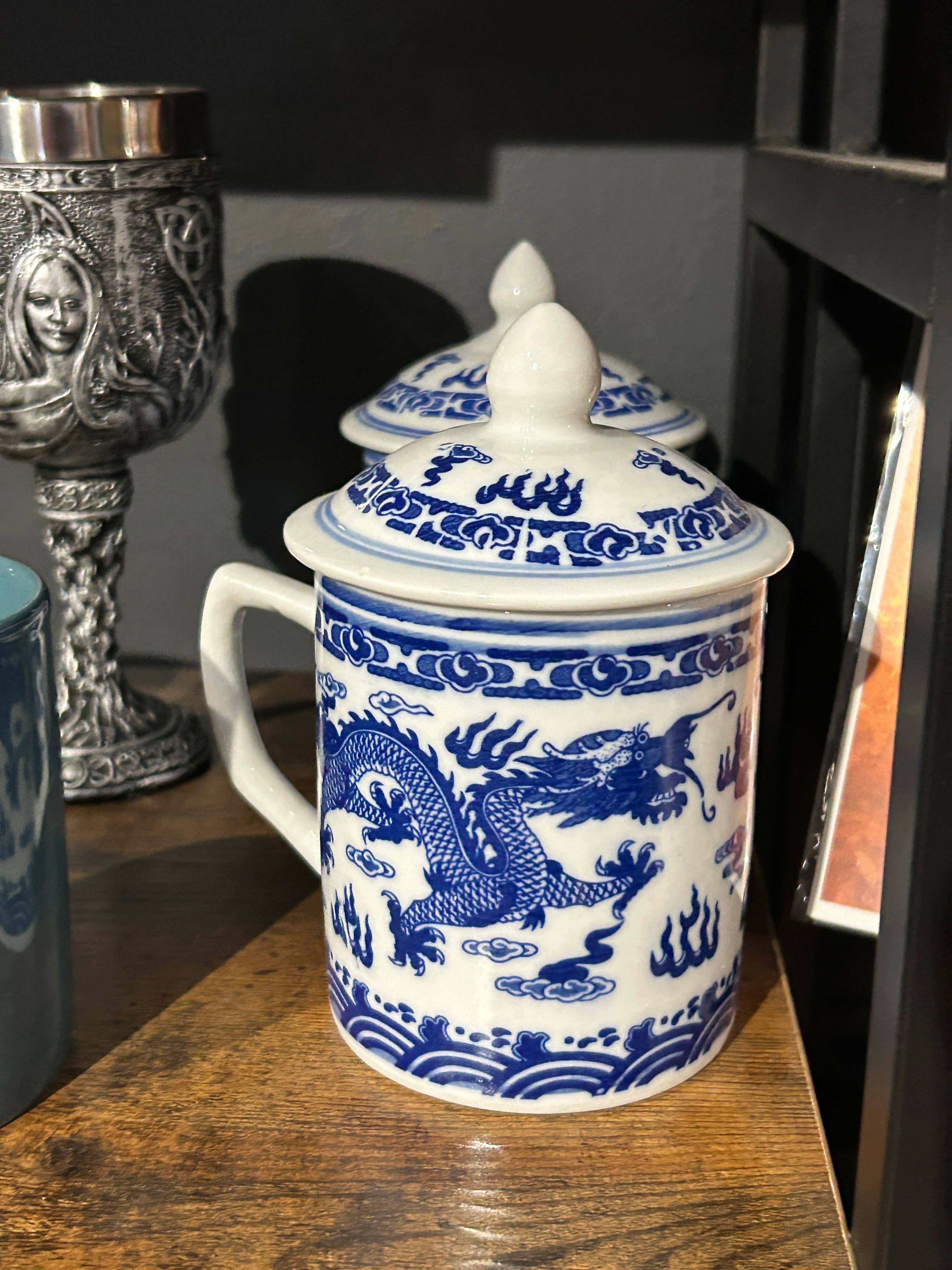 The ceremony of tea drinking is an ancient practice in China and around Asia. The cups you drink from are just as important as the tea itself. These beautifully decorated blue & white porcelain cups include a lid to keep your tea fresh and warm. Mug is decorated with a dragon - the most powerful and benevolent spiritual animal in Asian culture.  Size: 15 ounces