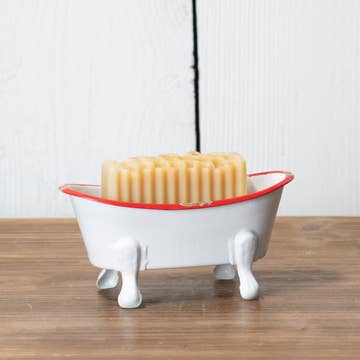 Black Rimmed Iron Bathtub Soap Dish is a metal soap dishin the shape of an old clawfoot tub. The vintage inspired bathroom accessory is painted a classic light gray color with black feet and a simple black trim. Measures 2" high by 5.5" wide by 2.5" deep.