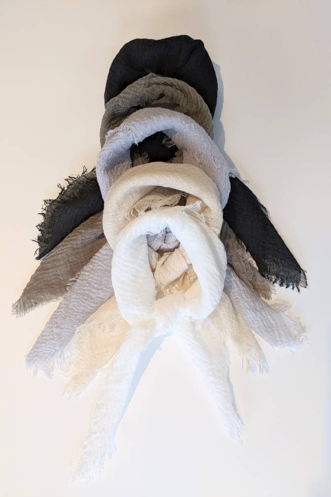 Flaxen - single scarves! This is a soft, smooth and lightweight scarf. (Square size 24" x 24") Introducing the flaxen scarf - the soft, smooth, and lightweight scarf you've been waiting for! Handmade in Minnesota. With a texture similar to crinkle gauze but with a smoother finish, the flaxen scarf is a thing of beauty. It's buttery soft to the touch, making it perfect for all-day wear. Material content is a viscose flax blend.