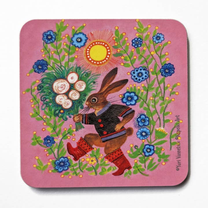 A drink coaster featuring an illustration by a Russian artist and illustrator Yuri Vasnetsov (1900-1973). Kapelki Art coasters are made in England, with a sustainable sourced Eucalyptus board base, melamine film surface and cork backing. No formaldehyde within the production process, unlike powdered alternatives Size: 10cm x 10cm The coaster is approximately 3.2mm thick with a gloss finish.