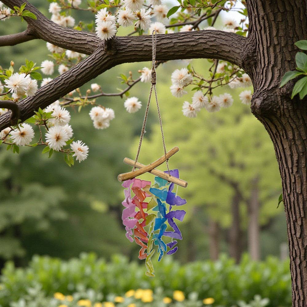 Made from upcyled seaglass and driftwood from the Hudson River. These unique windchimes vary in different sizes of assorted driftwood and seaglass sizes, tumbleness, and colors. No two are alike!