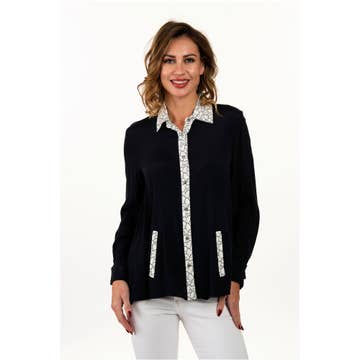 PLUS SIZE GREEK KEY BUTTON UP COLLARED BLOUSE. 96% POLYESTER, 4% SPANDEX.