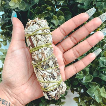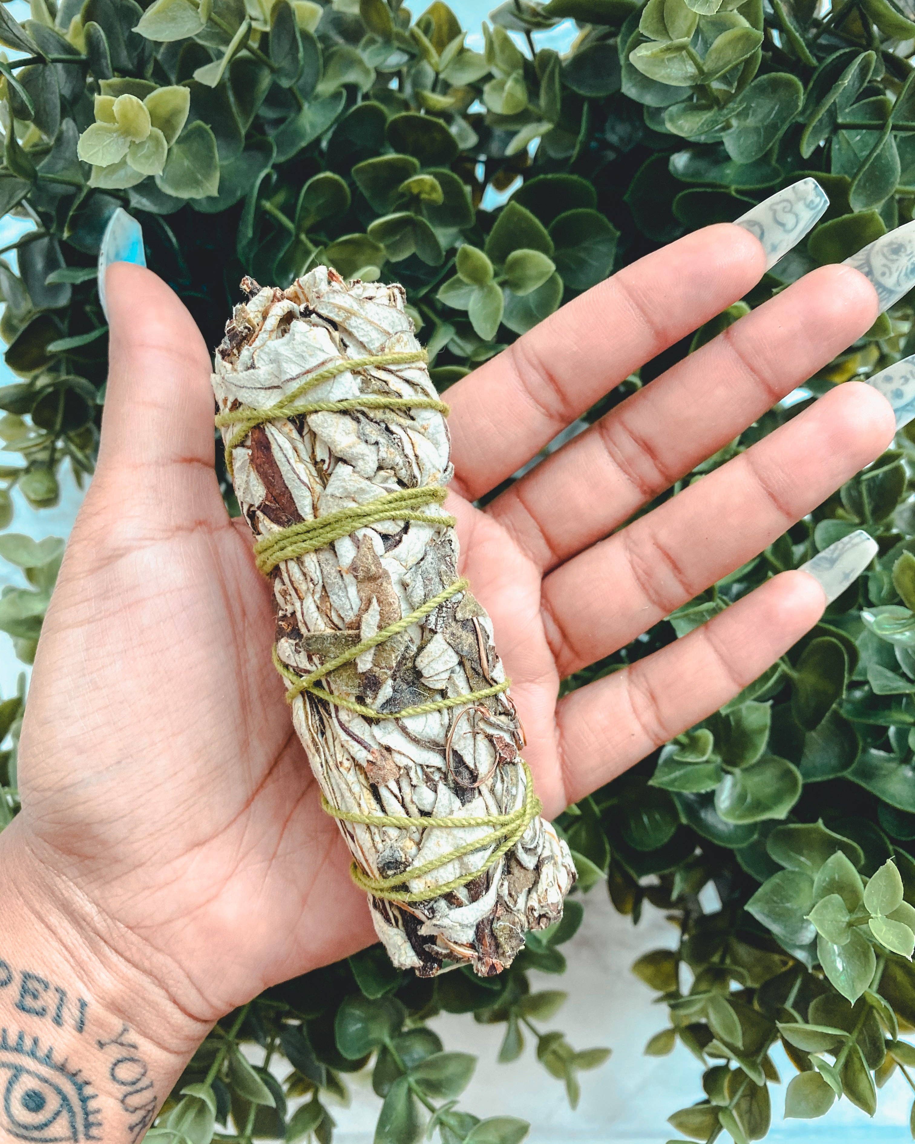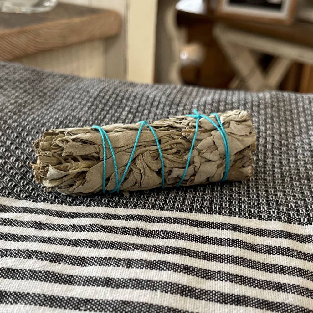White Sage and Eucalyptus Smudge Stick - 4" The addition of Eucalyptus to this smudging bundle can bring fresh energy to a situation and space and to heal regrets and worries. Sustainably sourced from an Indigenous reserve.